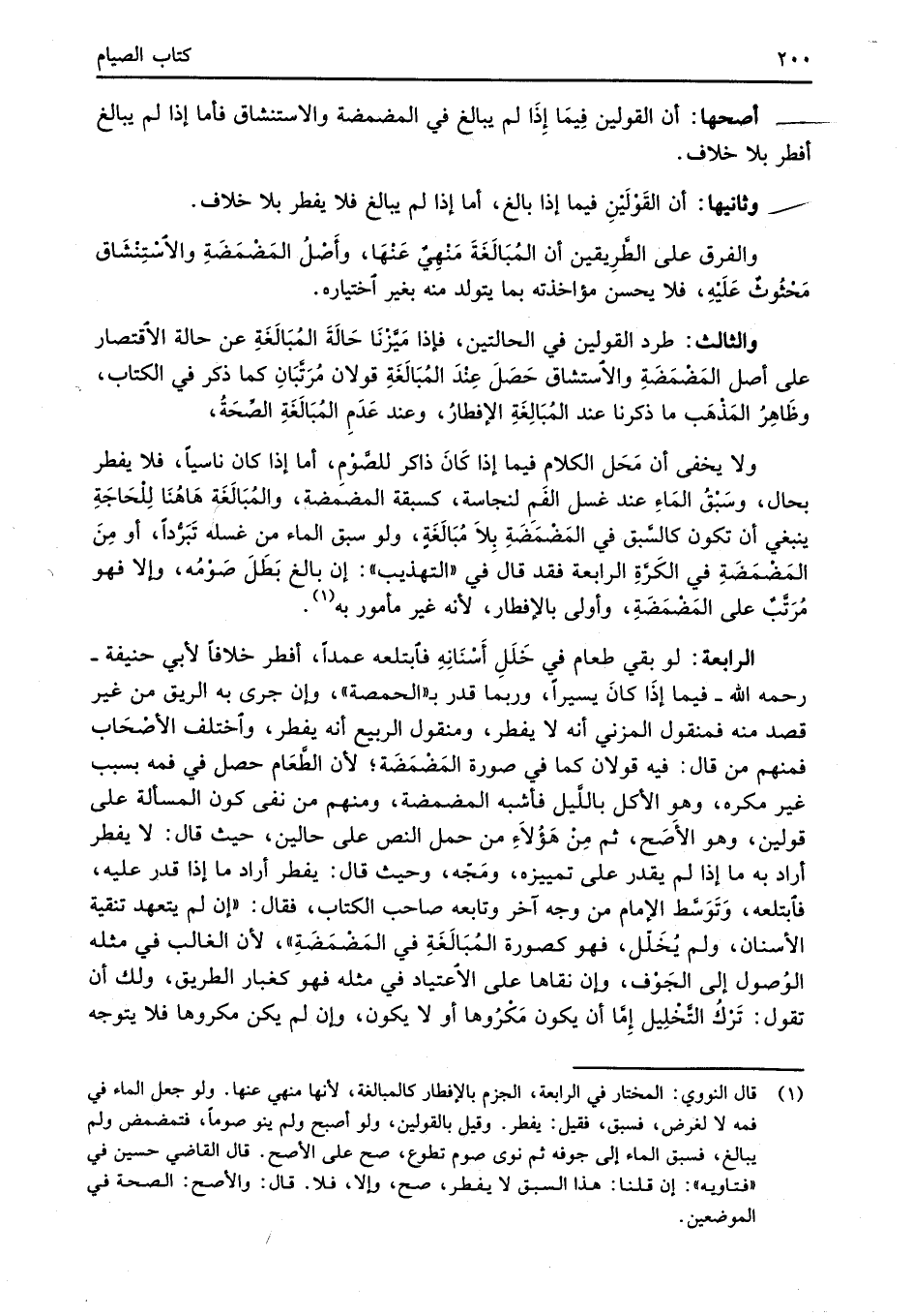 (¬1) قال النووي: المختار في الرابعة، الجزم بالإفطار كالمبالغة، لأنها منهي عنها. ولو جعل الماء في فمه لا لغرض، فسبق، فقيل: يفطر. وقيل بالقولين، ولو أصبح ولم ينو صوماً، فتمضمض ولم يبالغ، فسبق الماء إلى جرفه ثم نوى صوم تطوع، صح على الأصح. قال القاضي حسين في "فتاويه": إن قلنا: هذا السبق لا يفطر، صح، وإلا، فلا. قال: والأصح: الصحة في الموضعين.