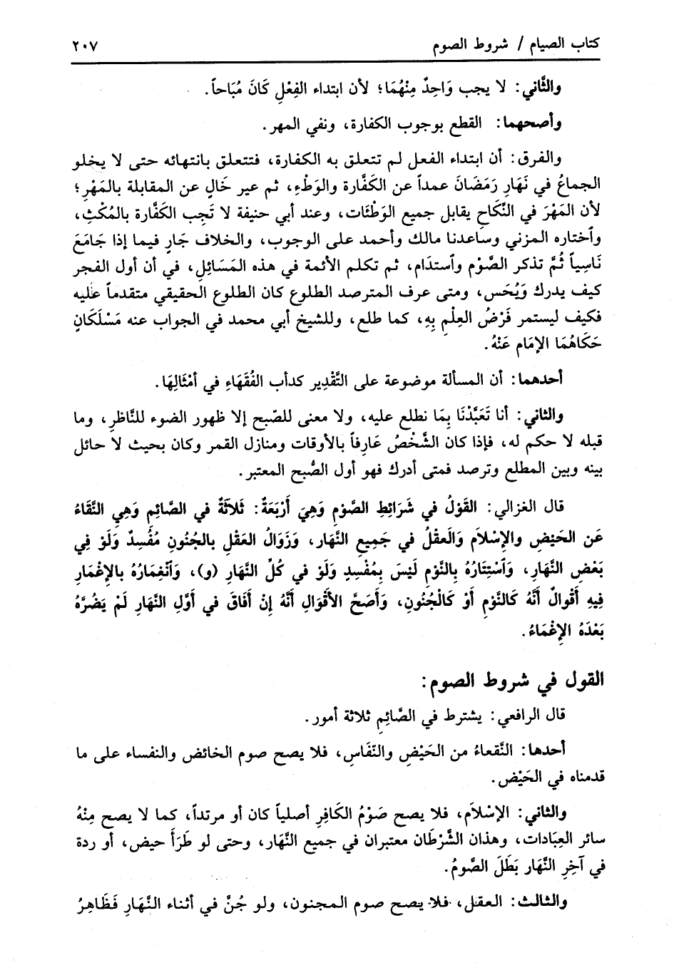قال الغزالي: القَوْلُ في شَرَائِطِ الصَّوْمِ وَهِيَ أَرْبَعَةٌ: ثَلاَثةٌ في الصَّائِم وَهِيِ النَّقَاة عَن الحَيْض والإِسْلاَم وَالَعقْلُ في جَمِيعِ النَّهَار، وَزَوَال العَقْلِ بالجُنُونِ مُفسِدٌ وَلَوْ فِي بَعْضِ النَّهَارِ، وَاسْتِتَارُه بِالنَّوْمِ لَيْسَ بِمُفْسِد وَلَوْ في كُلِّ النَّهَارِ (و)، وَانْغِمَارُهُ بالإِغْمَارِ فِيهِ أَقْوالٌ أنَّهُ كالنَّوْمِ أَوْ كالْجُنُونِ، وَأَصَحَّ الأَقْوَالِ أنَّهُ إنْ أَفَاقَ في أَوَّلِ النَّهَارِ لَمْ يَضُرَّهُ بَعْدَهُ الإِغْمَاءُ.