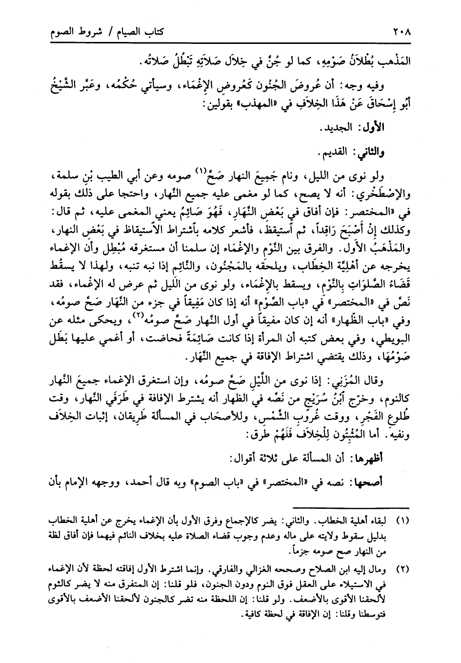 (¬1) لبقاء أهلية الخطاب. والثاني: يضر كالإجماع وفرق الأول بأن الإغماء يخرج عن أهلية الخطاب بدليل سقوط ولايته على ماله وعدم وجوب قضاء الصلاة عليه بخلاف النائم فيهما فإن أفاق لظة من النهار صح صومه جزماً.