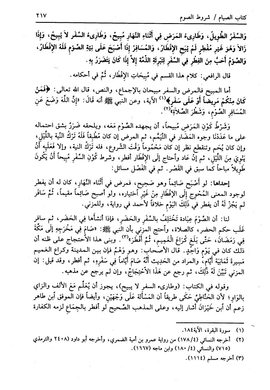 وقوله في الكتاب: (وطارئ السفر لا يبيح)، يجوز أن يُعَلَّم مَعَ الألف والزاي بالوَاوِ؛ لأن الحَنَّاطِيَّ حَكَى طريقاً أن المَسْأَلة عَلَى وَجْهَيْنِ، وأيضاً فإن الموفق ابن طاهر زعم أن ابن خَيْرَانَ أشار إليه، وعلى المذهب الصَّحيح لو أفطر بالجِمَاعِ لزمه الكفارة