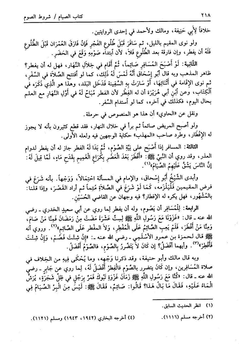 وبه قال مالك وأبو حنيفة، وقد ذكرنا وَجْهِه، وما يُحْكَى فِيهِ من الخِلاف في صلاة المُسَافِرين، وإن كَانَ يتضرر بالصَّوْم فالْفِطرُ أَفْضَلُ لَه، لِما روي عن جَابِرِ -رضي الله عنه- قال: "كُنَّا مَعَ رَسُولِ اللهِ -صلى الله عليه وسلم- زَمَاَنَ غَزْوَةِ تَبُوكَ فَمَرَّ بِرَجُلٍ في ظِلِّ شَجَرَةٍ، يُرَشُّ الْمَاءُ عَلَيْهِ، فَقَالَ مَا بَالُ هَذا؟ قَالُوا: صَائِمٌ، فَقَالَ -صلى الله عليه وسلم-: لَيْسَ مِنَ الْبِرِّ الصِّيَامُ فِي