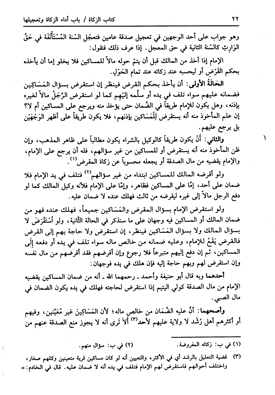الحَالَةُ الأولى: أن يأخذ بحكم القرض فينظر إن استقرض بسؤال المَسَاكِين فضمانه عليهم سواء تلف في يده أو سلَّمه إليْهِم كما لو استقرض الرَّجَلُ مالاً لغيره بإذنه، وهل يكون للإمام طريقاً في الضَّمان حتى يؤخذ منه ويرجع على المساكين أم لا؟ إن علم المأخوذ منه أنه يستقرض لِلْمَسَاكين بإذنهم، فلا يكون طريقاً على أظهر الوَجْهَيْن بل يرجع عليهم.