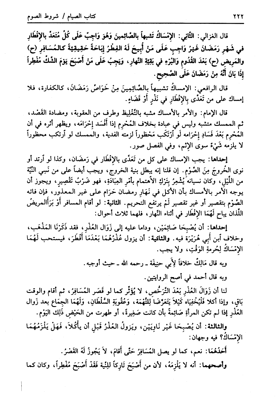 قال الغزالي: الثَّانِي: الإمْسَاكُ تَشبهاً بالصَّائِمينَ وَهُوَ وَاجِبٌ عَلَى كُلِّ مُتَعَدِّ بالإِفْطَارِ في شَهْرِ رَمَضَانَ غَيْرُ وَاجِبٍ عَلَى مَنْ أُبِيحَ لَهُ الفِطْرُ إِبَاحَةً حَقِيقِيَّةً كالمُسَافرِ (ح) والمَرِيضِ (ح) بَعْدَ القُدُومِ وَالبُرْءِ في بَقِيَّةِ النَّهارِ، وَبجِبُ عَلَى مَنْ أَصْبَحَ يَوْمَ الشَّكِّ مُفْطِراً إِذَا بَانَ أَنَّهُ مِنْ رَمَضَانَ عَلَى الصَّحِيحِ.