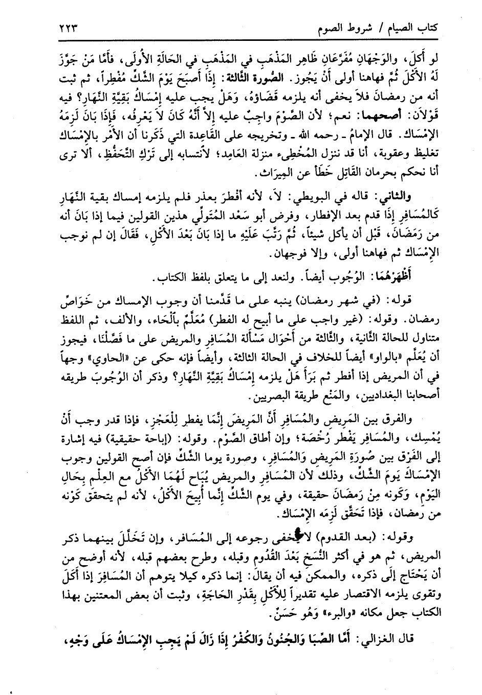 والفرق بين المَرِيضِ والمُسَافِرِ أَنَّ المَرِيضَ إِنَّمَا يفطر لِلْعَجْزِ، فإذا قدر وجب أَنْ يُمْسِك، والمُسَافِر يَفْطر رُخْصَة؛ وإن أطاق الصَّوْم. وقوله: (إباحة حقيقية) فيه إشارة إلى الفَرْق بين صُورَةِ المَرِيضِ وَالمُسَافِرِ، وصورة يوما الشَّكِّ فإن أصح القولين وجوب الإمْسَاكَ يَومَ الشَّكِّ، وذلك لأن المُسَافِرِ والمريض يُبَاح لَهُمَا الأكْلُ مع العِلْمِ بِحَالِ اليَوْمِ، وَكَونه مِنْ رَمضَانَ حقيقة، وفي يوم الشَّكِّ إِنَّما أُبِيحَ الأَكْلُ، لأنه لم يتحقق كَوْنه من رمضان، فإذا تَحَقَّق لَزِمَه الإمْسَاك.