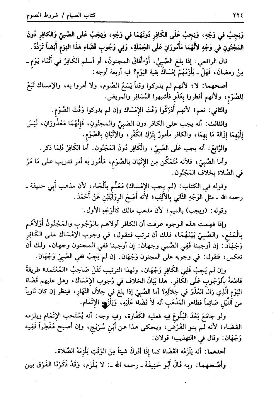 وإذا فهمت هذه الوجوه عرفت أن الكافر أولاهم بالوُجُوب والمَجْنُونُ أَوْلاَهُم بِالمَنْعِ، والصَّبِيّ بَيْنَهُمَا، ذلك أن ترتب فتقول، في وجوب الَإمْسَاك على الكَافِرِ وَجْهَان: إن أوجبنا فَفِي الصَّبي وجهان: إن أوجبنا ففي المجنون وجهان، ولك أن تعكس، فتقول: في وجوبه على المجنون وجْهَان. إن لم يَجِبْ ففي الصَّبِيِّ وجْهان.
