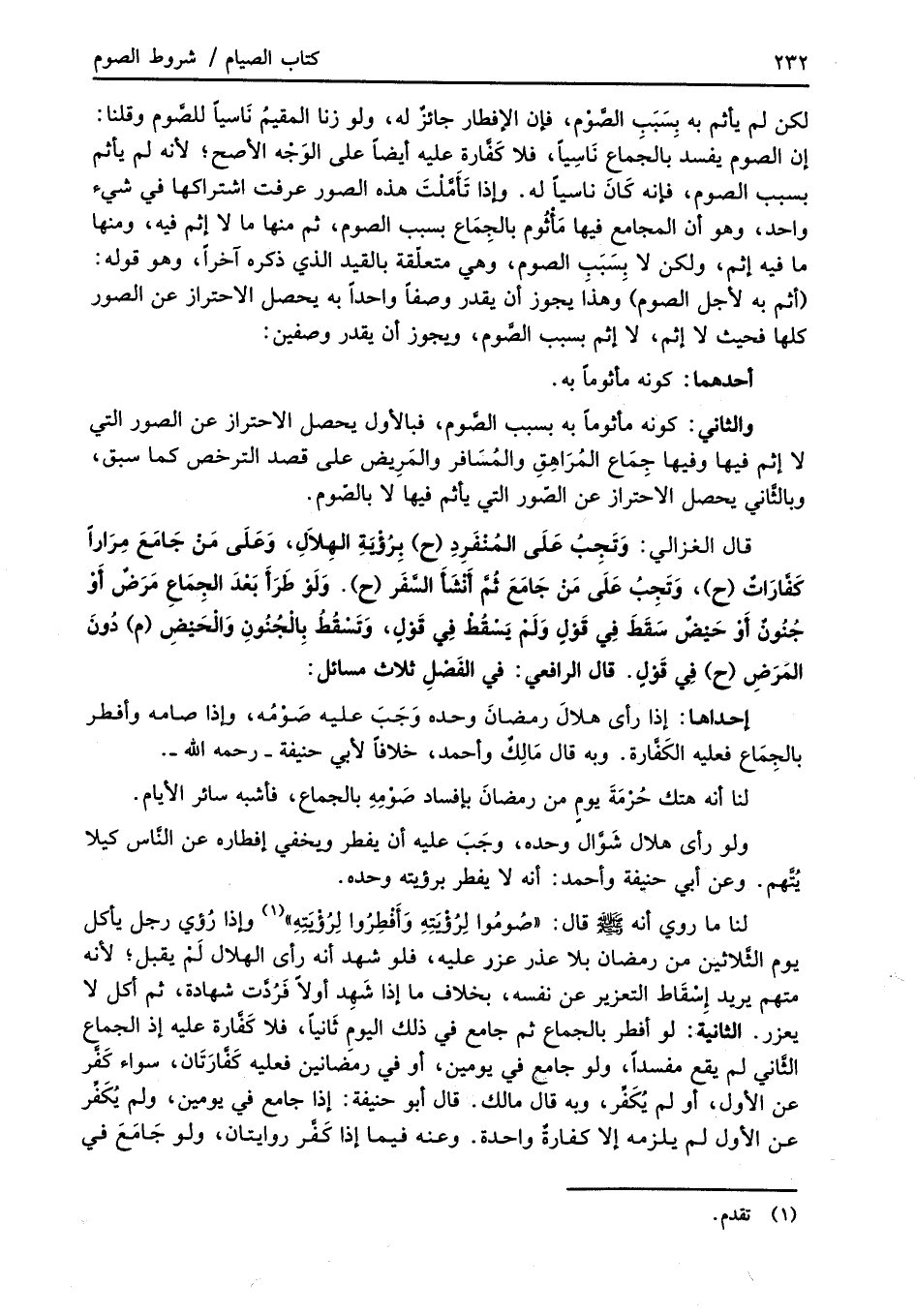 قال الغزالي: وَتَجِبُ عَلَى المُنْفَرِدِ (ح) بِرُؤْيةِ الهِلاَلِ، وَعَلَى مَنْ جَامَعَ مِرَاراً كَفَّارَاتٌ (ح)، وَتَجِبُ عَلَى مَنْ جَامَعَ ثُمَّ أنْشَأَ السَّفَر (ح). وَلَوْ طَرَأَ بَعْدَ الجِمَاعِ مَرَضٌ أَوْ جُنُونٌ أَوْ حَيْضٌ سَقَطَ فِي قَوْلٍ وَلَمْ يَسْقُطْ فِي قَوْلٍ، وَتَسْقُطُ بِالْجُنُونِ وَالْحَيْضِ (م) دُونَ المَرَضِ (ح) فِي قَوْلٍ.