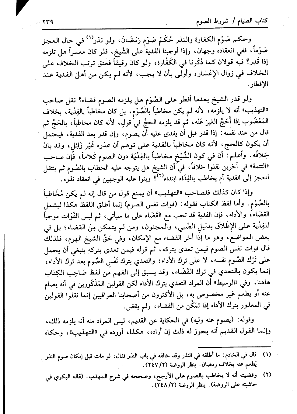 وإذا كان كذلك فلصاحب "التهذيب" أن يمنع قول من قال إنه لم يكن مُخَاطباً بالصَّوْمِ. وأما لفظ الكتاب فقوله: (فوات نفس الصوم) إنما أطلق اللفظ هكذا ليشمل القَضَاء، والأداء، فإن الفدية قد تجب مع القَضَاء على ما سيأتي، ثم ليس الفَوَات موجباً للفِدْية على الإطْلاَق بدليلِ الصَّبي، والمجنون، ومن لم يتمكن مِنَ القضاء؛ بل في بعض المواضعَ، وهو ما إذا أخر القضاء مع الإمكان، وفي حَقِّ الشيخ الهرم، فلذلك قال فوات نفس الصوم فيمن تعدى بتركه، ثم قوله فيمن تعدى بتركه ينبغي أن يحمل على تَرْك الصَّوم نفسه، لا على ترك الأداء؛ والتعدي بترك نَفْسِ الصَّوم بعد ترك الأداء، إنما يكون بالتعدي في ترك القَضَاء، وقد يسبق إلى الفهم من لفظ صَاحِب الكِتَاب هاهنا، وفي "الوسيط" أن المراد التعدي بترك الأداء لكن القولين المَذْكُورين في أنه يصام عنه أو يطعم غير مخصوص به، بل الأكثرون من أصحابنا العراقيين إنما نقلوا القولين في المعذور بترك الأداء إذا تمَكَّن من القضاء، ولم يقض.