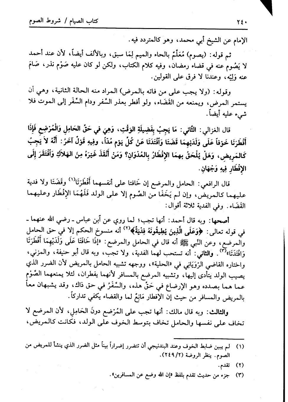(¬1) لم يبين ضابط الخوف وعند البندنيجي أن تتضرر إضراراً بيناً مثل الضرر الذي ينشأ للمريض من الصوم. ينظر الروضة (2/ 249).