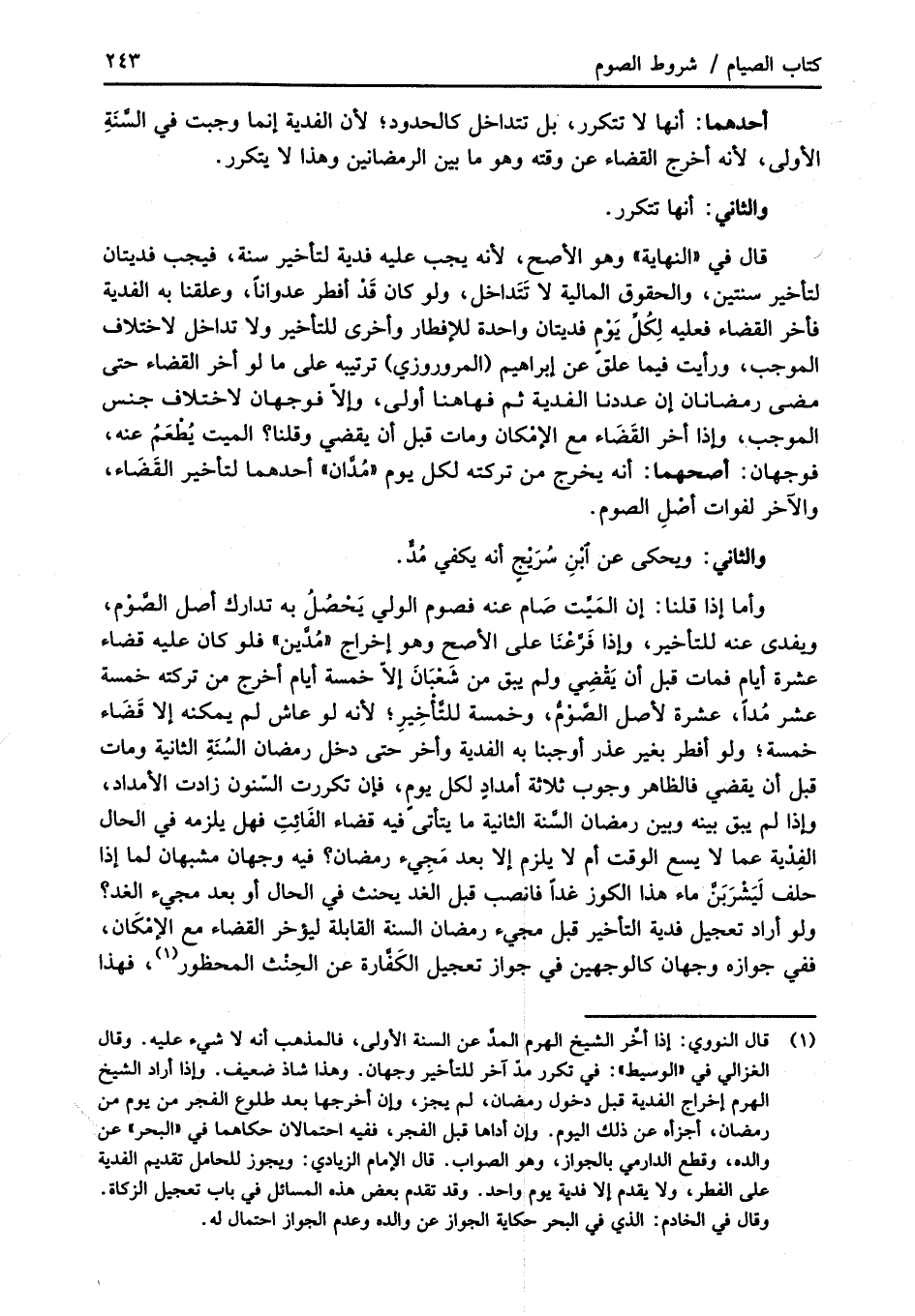 (¬1) قال النووي: إذا أخَّر الشيخ الهرم المدّ عن السنة الأولى، فالمذهب أنه لا شيء عليه. وقال الغزالي في "الوسيط": في تكرر مدّ آخر للتأخير وجهان. وهذا شاذ ضعيف. وإذا أراد الشيخ الهرم إخراج الفدية قبل دخول رمضان، لم يجز، وإن أخرجها بعد طلوع الفجر من يوم من رمضان، أجزأه عن ذلك اليوم. وإن أداها قبل الفجر، ففيه احتمالان حكاهما في "البحر" عن والده، وقطع الدارمي بالجواز، وهو الصواب. قال الإمام الزيادي: ويجوز للحامل تقديم الفدية على الفطر، ولا يقدم إلا فدية يوم واحد. وقد تقدم بعض هذه المسائل في باب تعجيل الزكاة. وقال في الخادم: الذي في البحر حكاية الجواز عن والده وعدم الجواز احتمال له.