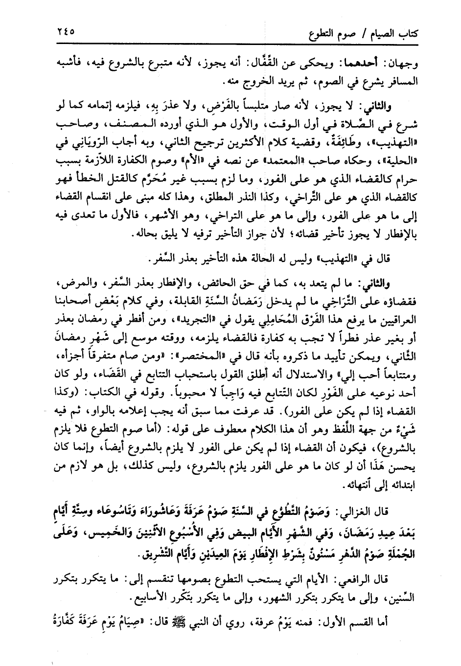 قال الرافعي: الأيام التي يستحب التطوع بصومها تنقسم إلى: ما يتكرر بتكرر السِّنين، إلى ما يتكرر بتكرر المشهور، وإلى ما يتكرر بتَكّرر الأسابيع.
