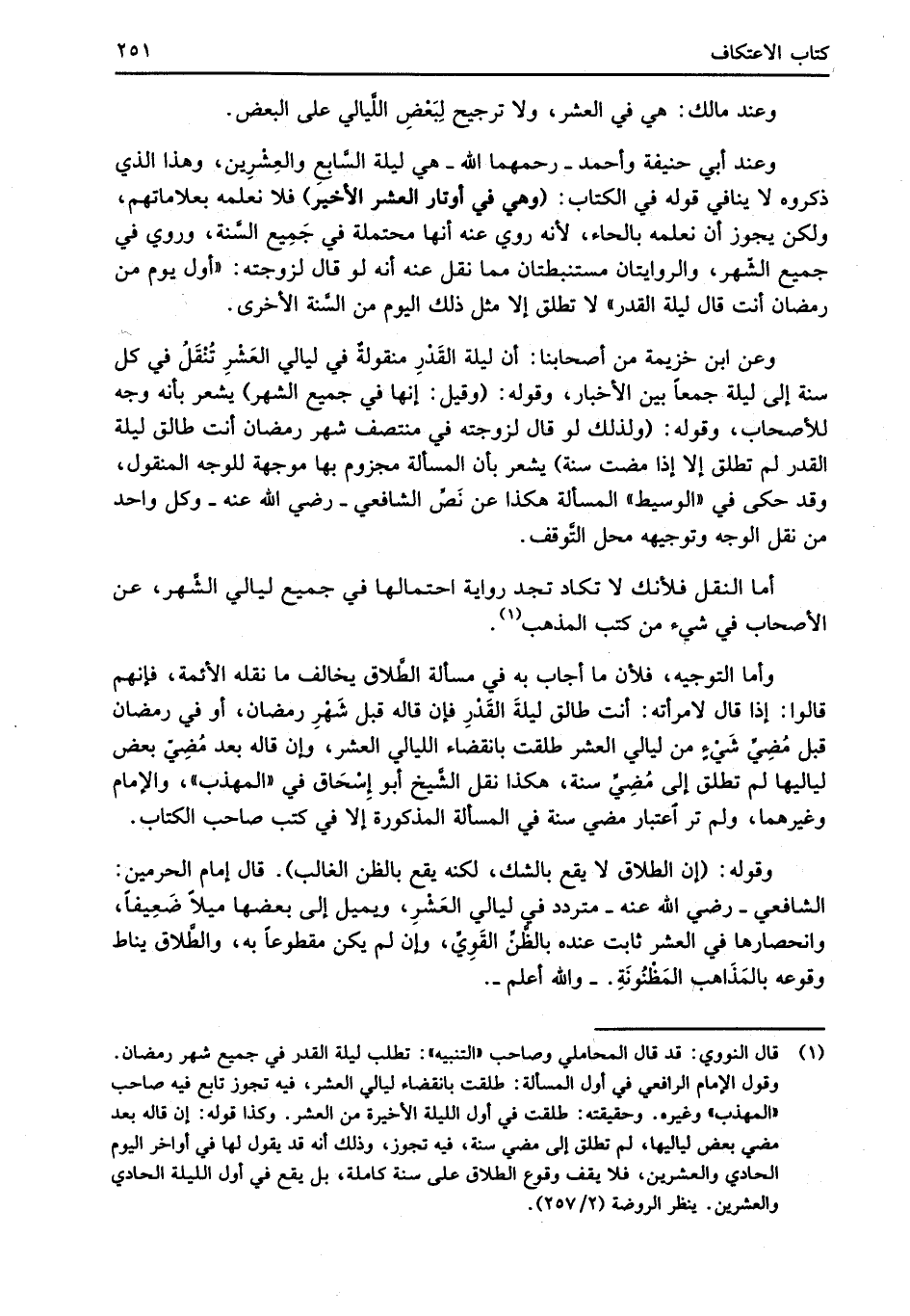 (¬1) قال النووي: قد قال المحاملي وصاحب "التنبيه": تطلب ليلة القدر في جميع شهر رمضان. وقول الإمام الرافعي في أول المسألة: طلقت بانقضاء ليالي العشر، فيه تجوز تابع فيه صاحب "المهذب" وغيره. وحقيقته: طلقت في أول الليلة الأخيرة من العشر. وكذا قوله: إن قاله بعد مضي بعض لياليها، لم تطلق إلى مضي سنة، فيه تجوز، وذلك أنه قد يقول لها في أواخر اليوم الحادي والعشرين، فلا يقف وقوع الطلاق على سنة كاملة، بل يقع في أول الليلة الحادي والعشرين. ينظر الروضة (2/ 257).