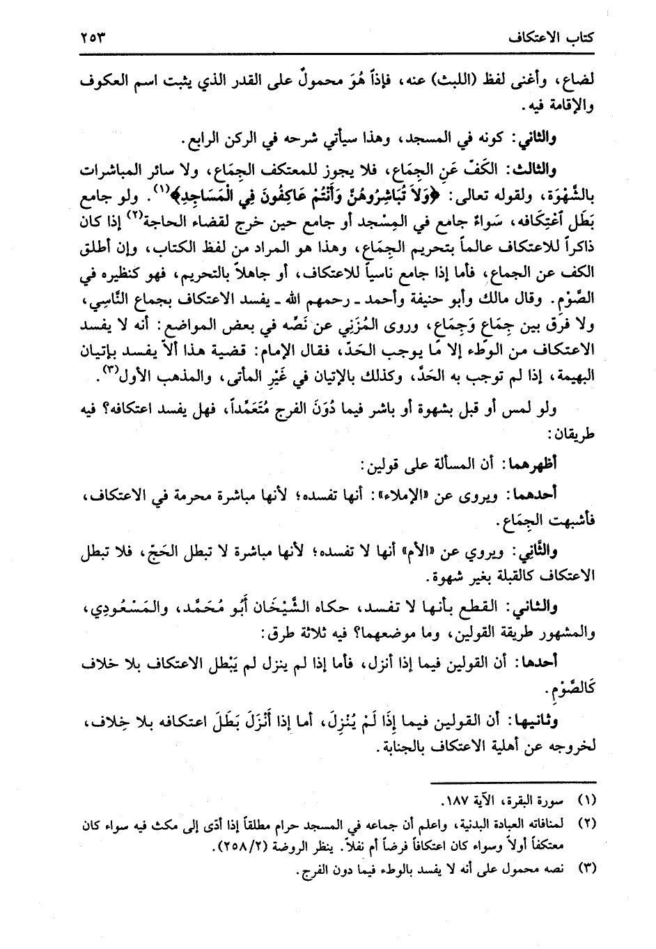 (¬2) لمنافاته العبادة البدنية، واعلم أن جماعه في المسجد حرام مطلقاً إذا أدى إلى مكث فيه سواء كان معتكفاً أولاً وسواء كان اعتكافاً فرضاً أم نفلاً. ينظر الروضة (2/ 258).