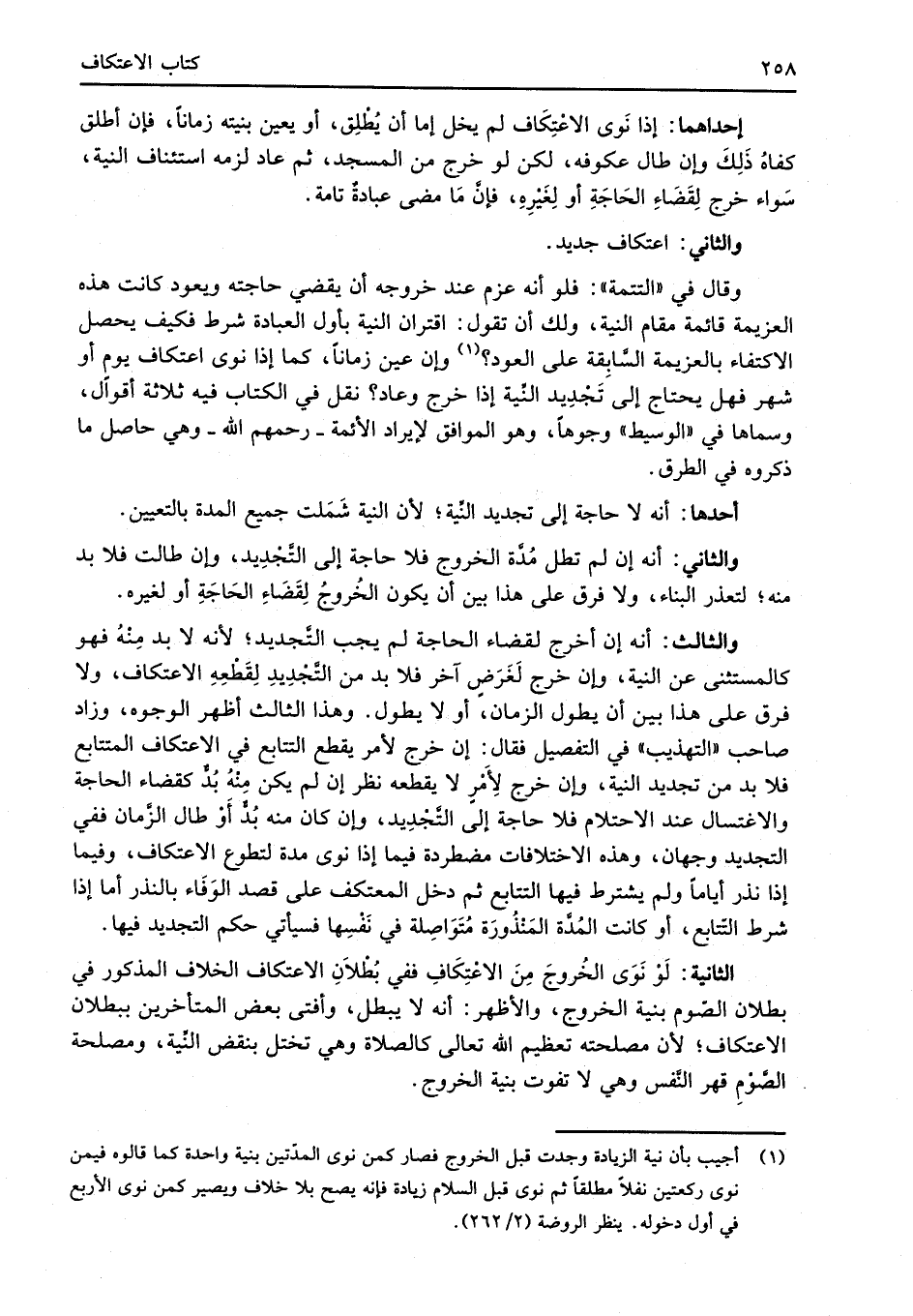 (¬1) أجيب بأن نية الزيادة وجدت قبل الخروج فصار كمن نوى المدّتين بنية واحدة كما قالوه فيمن نوى ركعتين نفلاً مطلقاً ثم نوى قبل السلام زيادة فإنه يصح بلا خلاف ويصير كمن نوى الأربع في أول دخوله. ينظر الروضة (2/ 262).