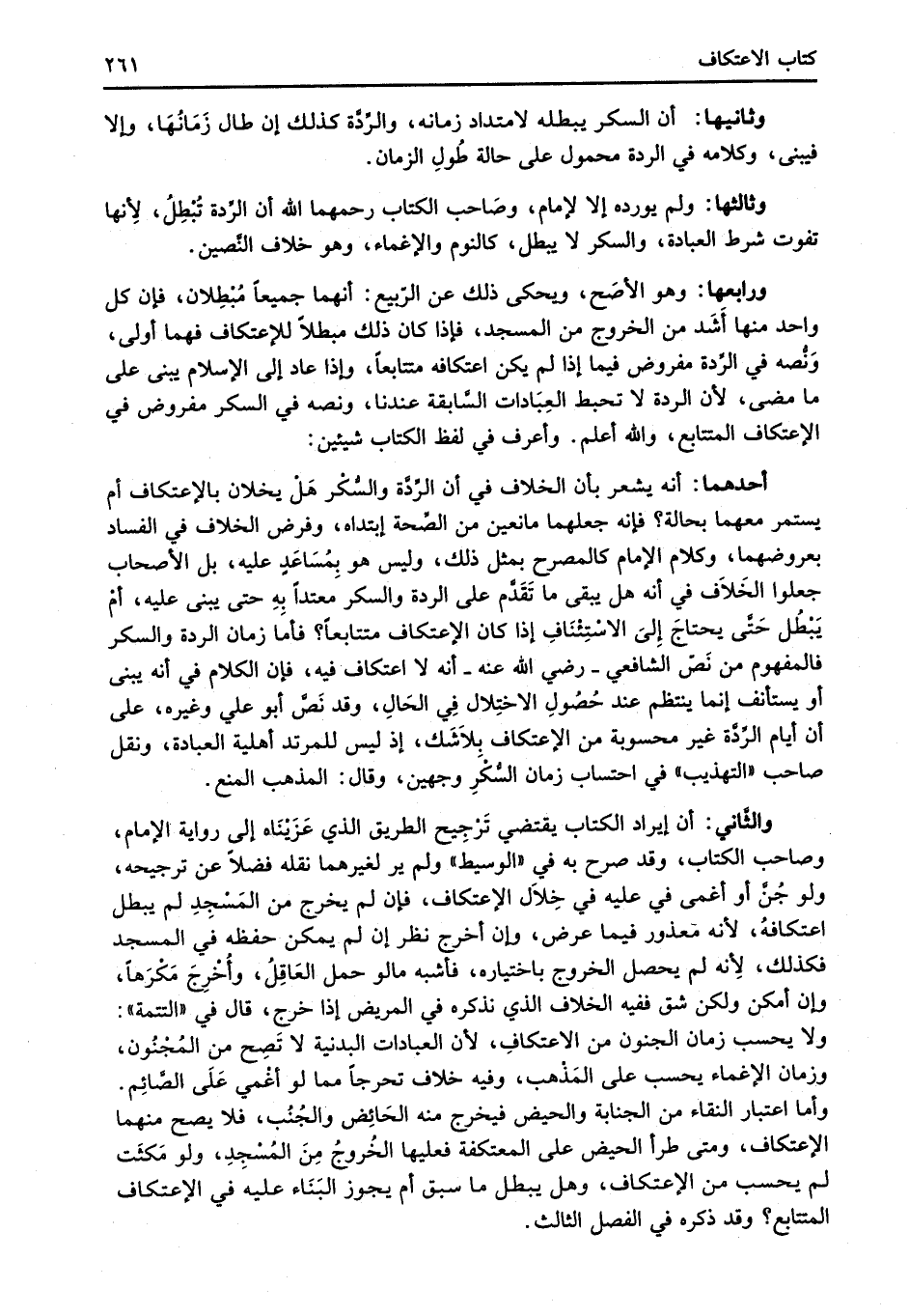 ورابعها: وهو الأصَح، ويحكى ذلك عن الرّبيع: أنهما جميعاً مُبْطِلان، فإن كل واحد منها أَشَد من الخروج من المسجد، فإذا كان ذلك مبطلاً للإعتكاف فهما أولى، وَنُّصه في الرِّدة مفروض فيما إذا لم يكن اعتكافه متتابعاً، وإذا عاد إلى الإسلام يبنى على ما مضى، لأن الردة لا تحبط العِبَادات السَّابقة عندنا، ونصه في السكر مفروض في الإعتكاف المتتابع، والله أعلم. وأعرف في لفظ الكتاب شيئين: