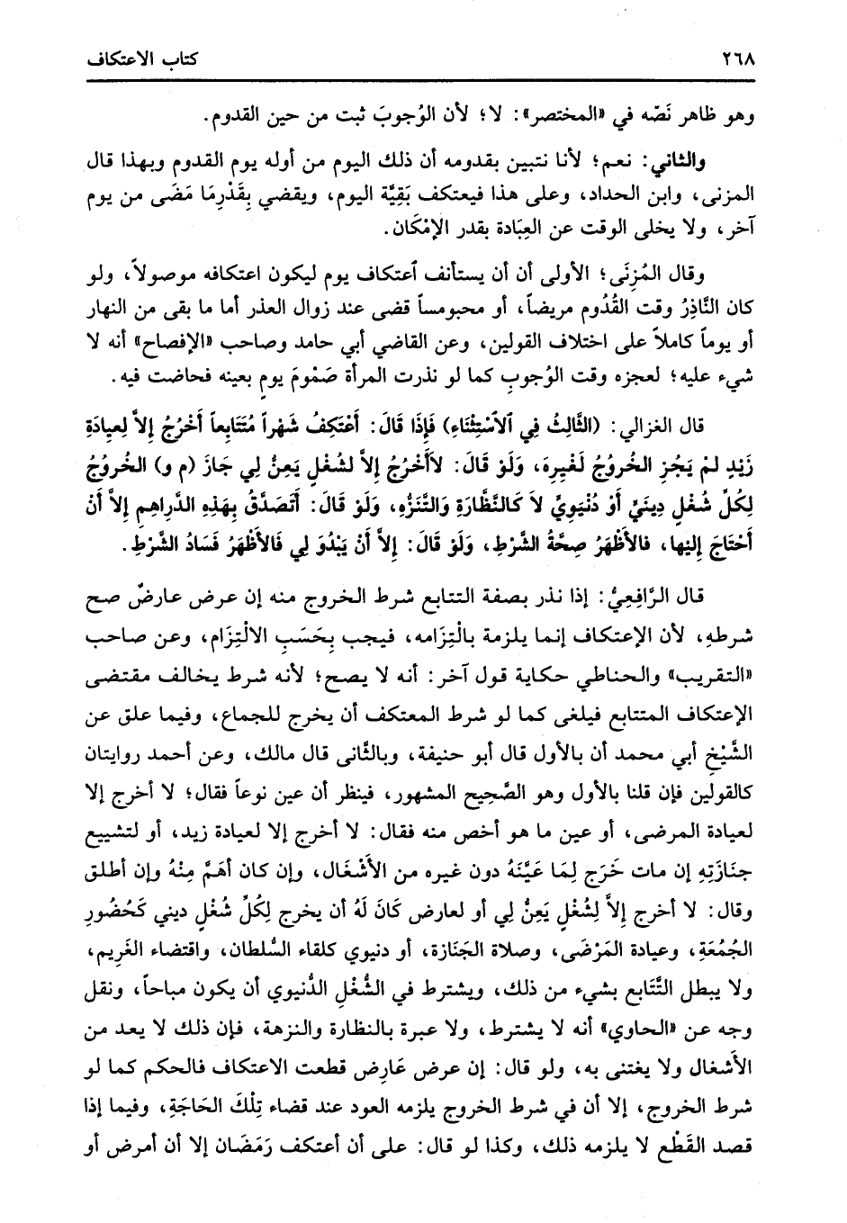 قال الرَّافِعِيُّ: إذا نذر بصفة التتابع شرط الخروج منه إن عرض عارضٌ صح شرطهِ، لأن الإعتكاف إنما يلزمة بالْتِزَامه، فيجب بِحَسَبِ الالْتِزَام، وعن صاحب "التقريب" والحناطي حكاية قول آخر: أنه لا يصح؛ لأنه شرط يخالف مقتضى الإعتكاف المتتابع فيلغى كما لو شرط المعتكف أن يخرج للجماع، وفيما علق عن الشَّيْخِ أبي محمد أن بالأول قال أبو حنيفة، وبالثَّانى قال مالك، وعن أحمد روايتان كالقولين فإن قلنا بالأول وهو الصَّحِيح المشهور، فينظر أن عين نوعًا فقال؛ لا أخرج إلا لعيادة المرضى، أو عين ما هو أخص منه فقال: لا أخرج إلا لعيادة زيد، أو لتشييع جنَازَتِهِ إن مات خَرَج لِمَا عَيَّنَهُ دون غيره من الأَشْغَال، وإن كان أهَمَّ مِنْهُ وإن أطلق وقال: لا أخرج إِلاَّ لِشُغْل يَعِنُّ لِي أو لعارض كَانَ لَهُ أن يخرج لِكُلِّ شُغْلٍ ديني كَحُضُورِ الجُمُعَةِ، وعيادة المَرْضَى، وصلاة الجَنَازة، أو دنيوي كلقاء السُّلطان، واقتضاء الغَرِيم، ولا يبطل التَّتَابع بشيء من ذلك، ويشترط في الشُّغْلِ الدُّنيوي أن يكون مباحاً، ونقل وجه عن "الحاوي" أنه لا يشترط، ولا عبرة بالنظارة والنزهة، فإن ذلك لا يعد من الأَشغال ولا يغتنى به، ولو قال: إن عرض عَارِض قطعت الاعتكاف فالحكم كما لو شرط الخروج، إلا أن في شرط الخروج يلزمه العود عند قضاء تِلْكَ الحَاجَةِ، وفيما إذا قصد القَطْع لا يلزمه ذلك، وكذا لو قال: على أن أعتكف رَمَضَان إلا أن أمرض أو