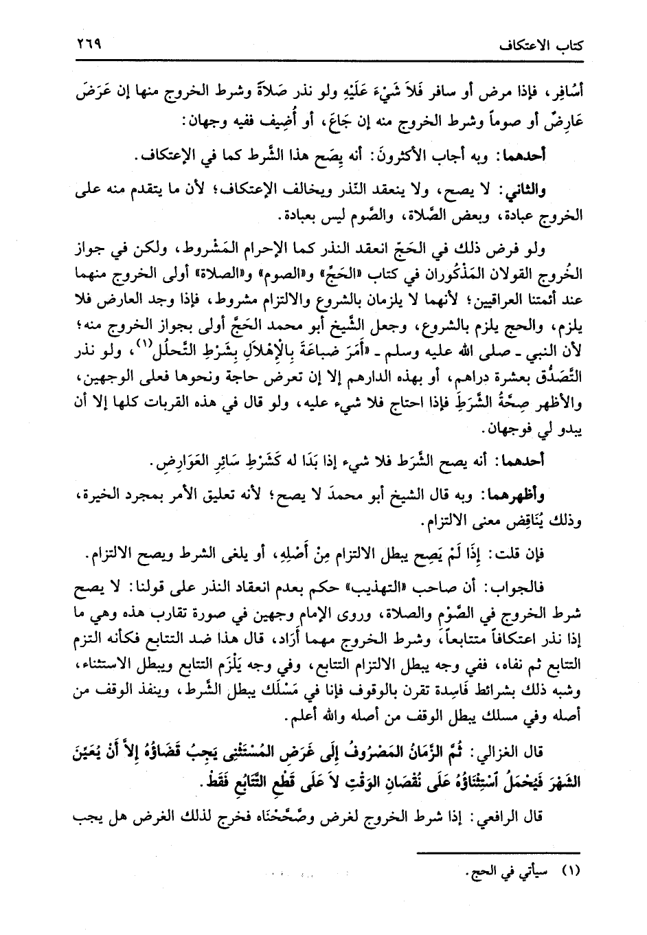 ولو فرض ذلك في الحَجّ انعقد النذر كما الإحرام المَشْروط، ولكن في جواز الخُروج القولان المَذْكُوران في كتاب "الحَجِّ" و"الصوم" و"الصلاة" أولى الخروج منهما عند أئمتنا العراقيين؛ لأنهما لا يلزمان بالشروع والالتزام مشروط، فإذا وجد العارض فلا يلزم، والحج يلزم بالشروع، وجعل الشَّيخ أبو محمد الحَجَّ أولى بجواز الخروج منه؛ لأن النبي- صلى الله عليه وسلم- "أَمَرَ ضباعَةَ بِالإهْلاَلِ بِشَرْطِ التَّحلُل (¬1)، ولو نذر التَّصَدُّق بعشرة دراهم، أو بهذه الدارهم إلا إن تعرض حاجة ونحوها فعلى الوجهين، والأظهر صِحَّةُ الشَّرَطِ فإذا احتاج فلا شيء عليه، ولو قال في هذه القربات كلها إلا أن يبدو لي فوجهان.