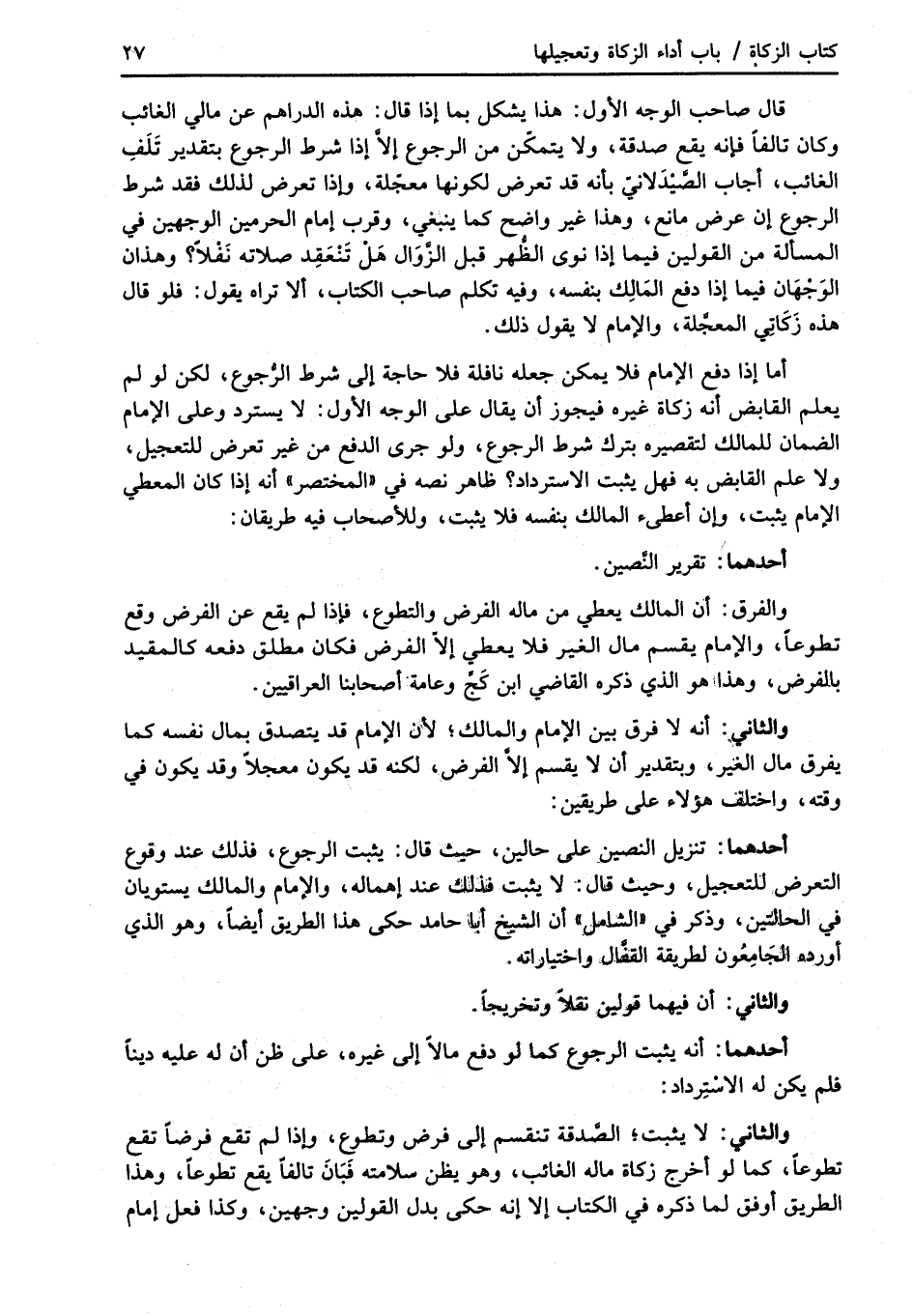 قال صاحب الوجه الأول: هذا يشكل بما إذا قال: هذه الدراهم عن مالي الغائب وكان تالفًا فإنه يقع صدقة، ولا يتمكّن من الرجوع إلاَّ إذا شرط الرجوع بتقدير تَلَفِ الغائب، أجاب الصَّيْدَلانيّ بأنه قد تعرض لكونها معجّلة، وإذا تعرض لذلك فقد شرط الرجوع إن عرض مانع، وهذا غير واضح كما ينبغي، وقرب إمام الحرمين الوجهين في المسألة من القولين فيما إذا نوى الظُّهر قبل الزَّوَال هَل تَنْعَقِد صلاته نَفْلاً؟ وهذان الوَجْهَان فيما إذا دفع المَالِك بنفسه، وفيه تكلم صاحب الكتاب، ألا تراه يقول: فلو قال هذه زَكَاتي المعجَّلة، والإمام لا يقول ذلك.