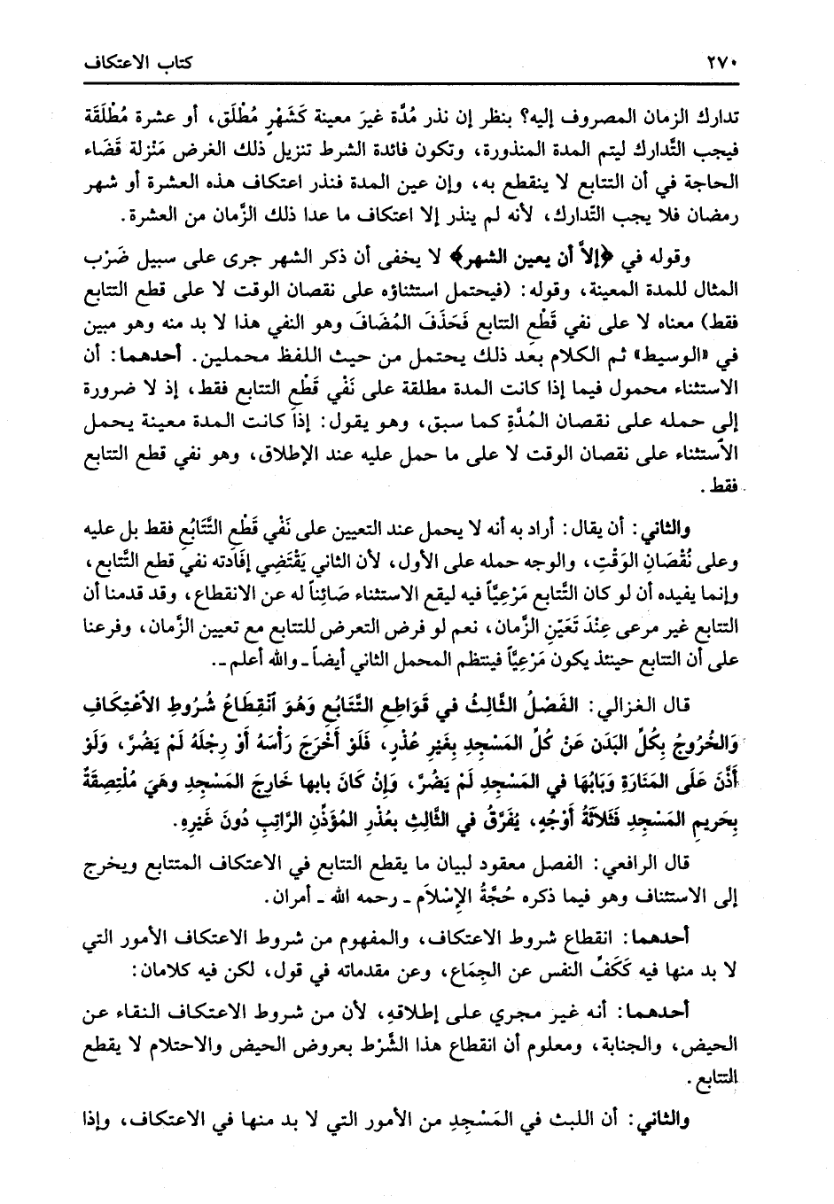 قال الغزالي: الفَصْلُ الثَّالِث في قَوَاطِعِ التَّتَابُعِ وَهُوَ انْقِطَاع شُرُوطِ الاعْتِكَافِ وَالخُرُوجُ بِكُلِّ البَدَن عَنْ كُلِّ المَسْجِدِ بِغَيْرِ عُذْرٍ، فَلَوْ أَخْرَجَ رَأْسَهُ أَوْ رِجْلَهُ لَمْ يَضُرَّ، وَلَوْ أَذَّنَ عَلَى المَنَارَةِ وَبَابُهَا في المَسْجِدِ لَمْ يَضُرَّ، وَإِنْ كَانَ بابها خَارجَ المَسْجِدِ وهَيَ مُلْتِصِقَةٌ بِحَريمِ المَسْجِدِ فَثَلاَثةُ أَوْجُهٍ، يفَرَّقُ في الثَّالِثِ بعُذْرِ المُؤَذِّنِ الرَّاتِبِ دُونَ غَيْرِهِ.