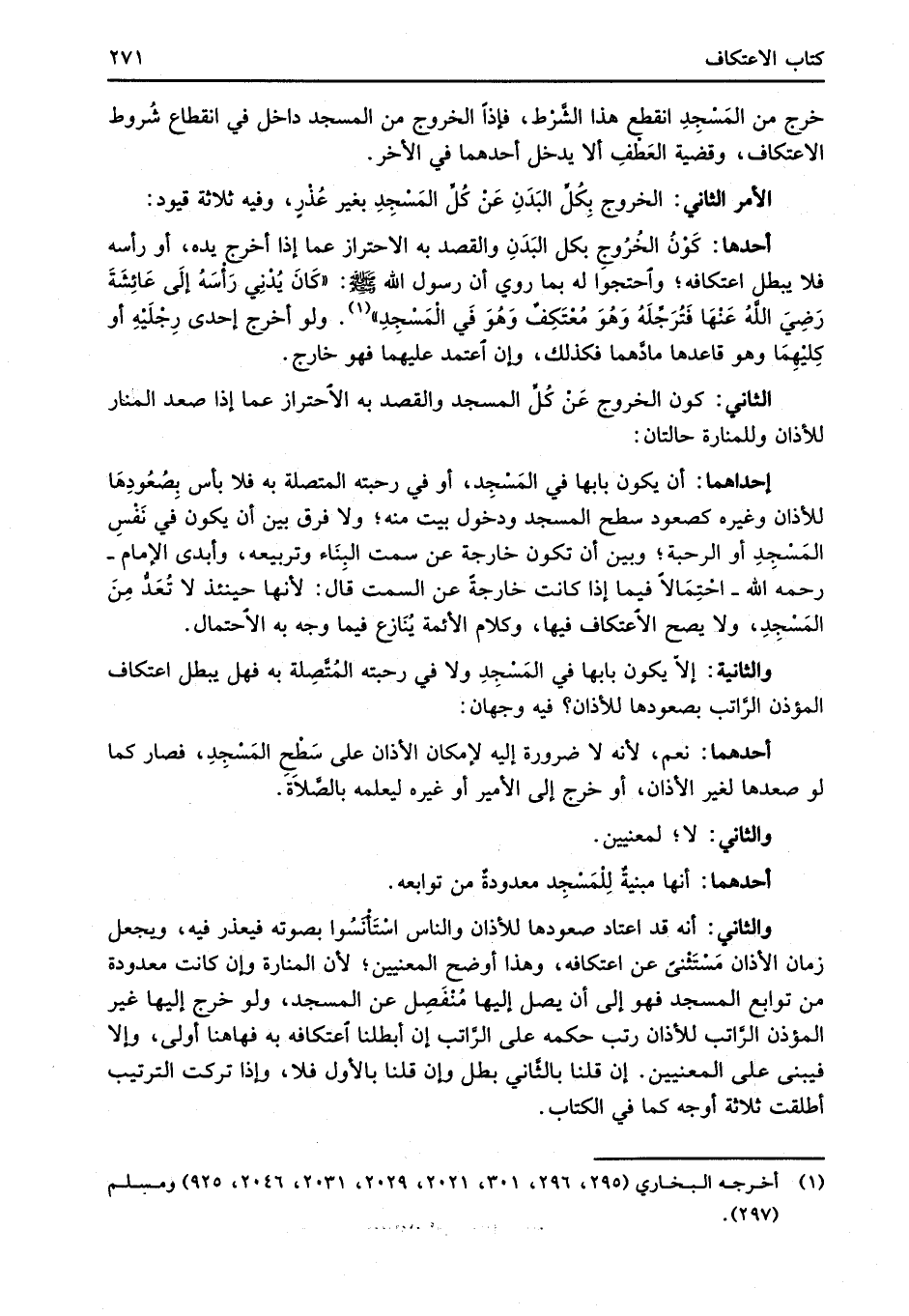 الثاني: كون الخروج عَنْ كُلِّ المسجد والقصد به الاحتراز عما إذا صعد المنار للأذان وللمنارة حالتان: