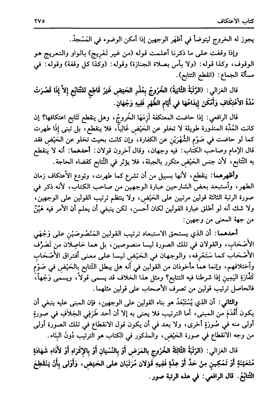 قال الغزالي: (الرُّتْبَةُ الثَّانِيَةُ) الخُرُوجُ بِعُذْرِ الحَيْضِ غَيْرُ قَاطِعٍ للتَّتَابُعِ إِلاَّ إِذَا قَصُرَتْ مُدَّةُ الاعْتِكَافِ وَأَمْكَنَ إيدَاعُهَا في أَيَّامِ الطُّهْرِ فَفِيهِ وَجْهَانِ.