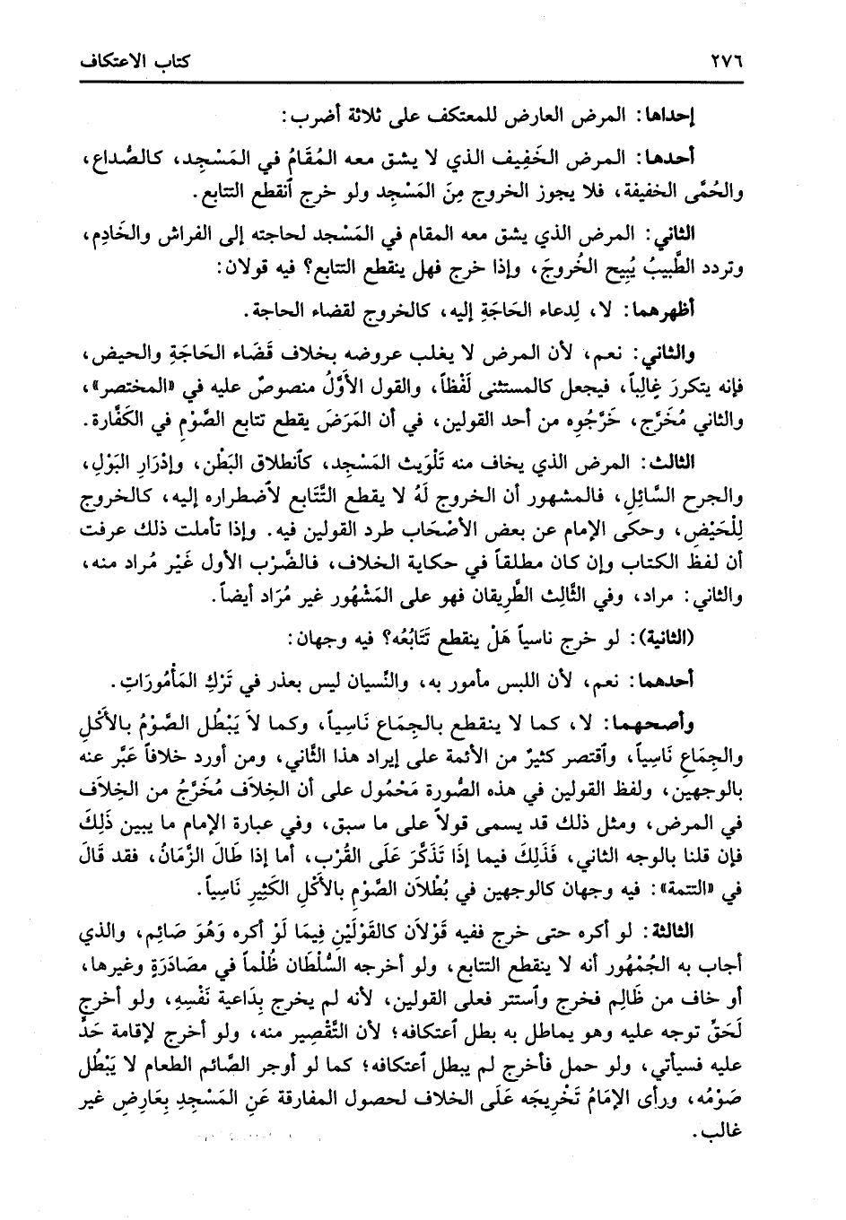 الثاني: المرض الذي يشق معه المقام في المَسْجد لحاجته إلى الفراش والخَادِم، وتردد الطَّبيبُ يُبِيح الخُروجَ، وإذا خرج فهل ينقطع التتابع؟ فيه قولان: