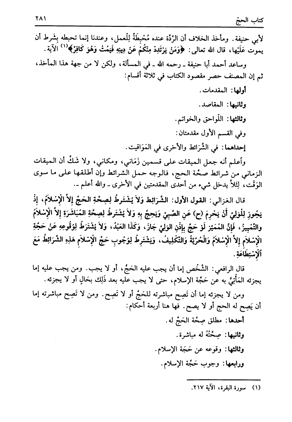 قال الغزالي: القول الأول: الشَّرَائِط وَلاَ يُشْتَرطُ لِصِحَّةِ الحَجِّ إِلاَّ الْإِسْلاَمُ، إِذْ يَجُوزِ لِلْوَليِّ أَنْ يَحْرِمَ (ح) عَنِ الصَّبِيِّ وَيحِجَّ بِهِ وَلاَ يُشْتَرطُ لِصِحَّةِ المُبَاشَرَةِ إِلاَّ الإسْلاَمُ والتَّمْيِيزُ، فَإِنَّ المُمَيِّز لَوْ حَج بِإذْنِ الوَليِّ جَازَ، وَكَذَا العَبْدُ، وَلاَ يُشْتَرَطُ لِوُقُوعِهِ عَنْ حَجَّةِ الإسْلاَمِ إِلاَّ الْإِسْلاَمُ وَالحُرِّيَّةُ وَالتَّكْلِيفُ، وَيَشْتَرِطُ لِوُجُوبِ حَجِّ الإسْلاَمِ هَذِهِ الشَّرَائِطُ مَعَ الْإِسْتِطَاعَةِ.