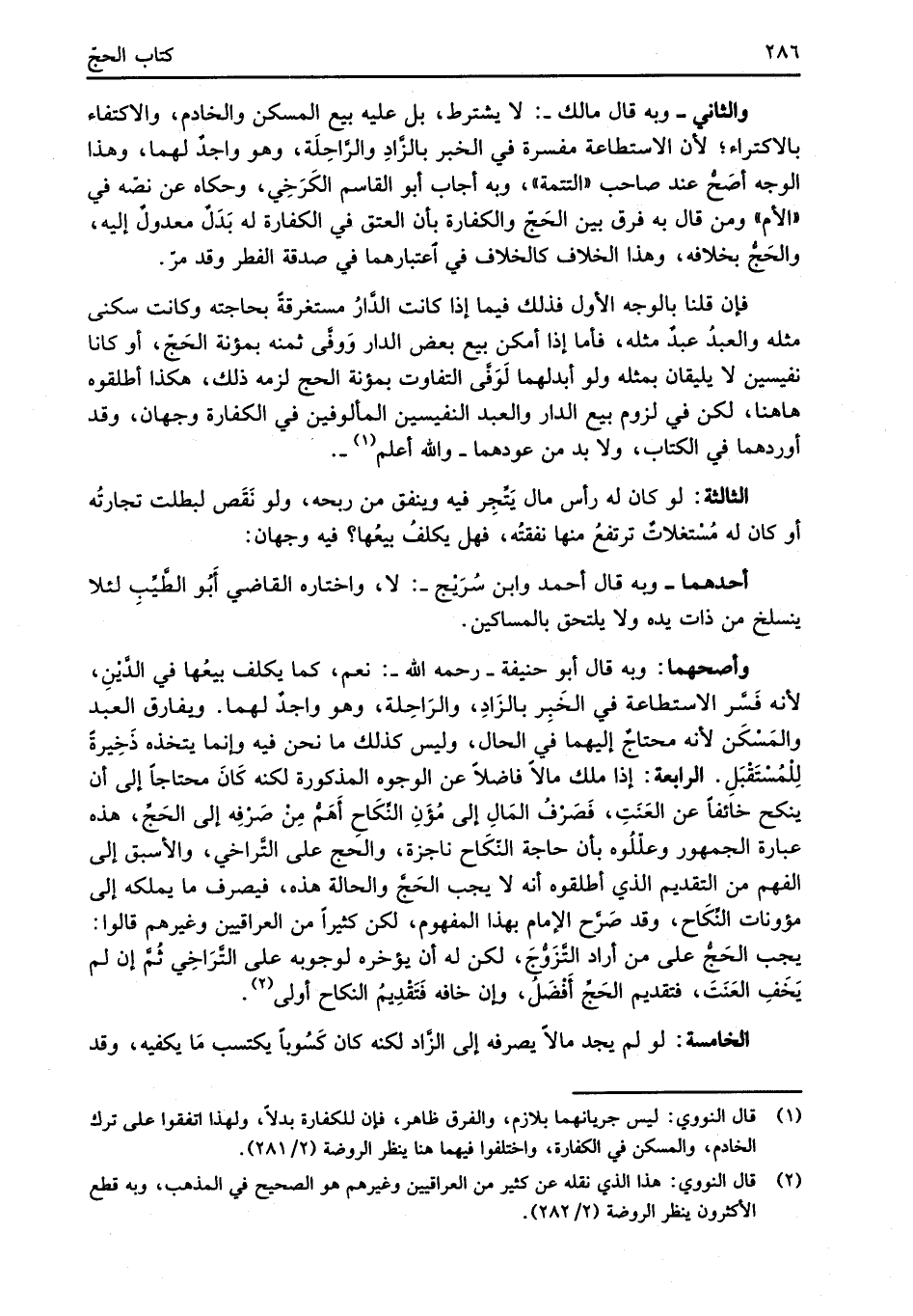 وأصحهما: وبه قال أبو حنيفة -رحمه الله-: نعم، كما يكلف بيعُها في الدَّيْنِ، لأنه فَسَّر الاستطاعة في الخَبِر بالزَادِ، والرَاحِلة، وهو واجدٌ لهما. ويفارق العبد والمَسْكَن لأنه محتاجٌ إليهما في الحال، وليس كذلك ما نحن فيه وإنما يتخذه ذَخِيرةً لِلْمُسْتَقْبَلِ. الرابعة: إذا ملك مالاً فاضلاً عن الوجوه المذكورة لكنه كَانَ محتاجاً إلى أن ينكح خائفاً عن العَنَتِ، فَصَرْفُ المَالِ إلى مُؤَنِ النِّكاح أَهَمُّ مِنْ صَرفِه إلى الحَجِّ، هذه عبارة الجمهور وعلّلُوه بأن حاجة النِّكَاح ناجزة، والحج على التَّراخي، والأسبق إلى الفهم من التقديم الذي أطلقوه أنه لا يجب الحَجَّ والحالة هذه، فيصرف ما يملكه إلى مؤونات النِّكَاح، وقد صَرَّح الإمام بهذا المفهوم، لكن كثيراً من العراقيين وغيرهم قالوا: يجب الحَجُّ على من أراد التَّزَوُّجَ، لكن له أن يؤخره لوجوبه على التَّرَاخِي ثُمَّ إن لم يَخَفِ العَنَتَ، فتقديم الحَجِّ أَفْضَلُ، وإن خافه فَتَقْدِيمُ النكاح أولى (¬2).