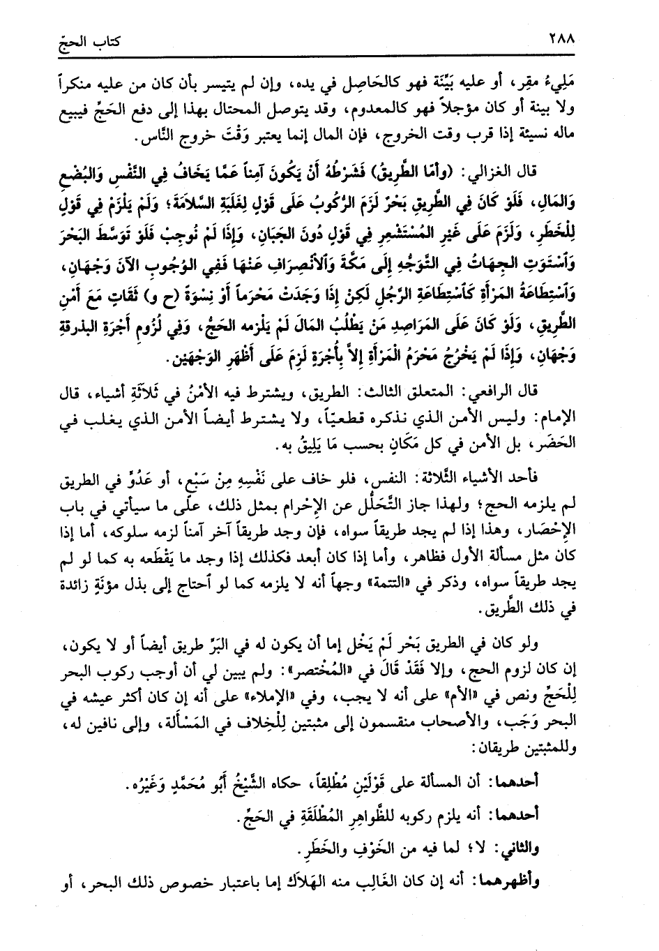 قال الغزالي: (وأمّا الطَّرِيقُ) فَشَرْطُهُ أَنْ يَكُونَ آمِنًا عَمَّا يَخَافُ فِي النَّفْسِ وَالبُضْعِ وَالمَالِ، فَلَوْ كَانَ فِي الطَّرِيقِ بَحْرٌ لَزَمَ الرُّكُوبُ عَلَى قَوْلٍ لِغَلَبَةِ السَّلاَمَةَ؛ وَلَمْ يَلْزَمْ فِي قَوْلٍ لِلْخَطَرِ، وَلَزَمَ عَلَى غَيْرِ المُسْتَشْعِرِ فِي قَوْلٍ دُونَ الجَبَانِ، وإذَا لَمْ نُوجِبْ فَلَوْ تَوَسَّطَ البَحْرَ وَاسْتَوَتِ الجِهَاتُ فِي التَّوَجُّهِ إِلَى مَكَّةَ وَالانْصِرَافِ عَنْهَا فَفِي الوُجُوبِ الآنَ وَجْهَانِ، وَاسْتِطَاعَةُ المَرْأَةِ كَاَسْتِطَاعَةِ الرَّجُلِ لَكِنْ إِذَا وَجَدَتْ مَحْرَماً أَوْ نِسْوَةً (ح و) ثَقَاتٍ مَعَ أَمْنِ الطَّرِيقِ، وَلَوْ كَانَ عَلَى المَرَاصِدِ مَنْ يَطْلُبُ المَالَ لَمْ يَلْزمه الحَجُّ، وَفِي لُزُومِ أَجْرَةِ البذرقةِ وَجْهَانِ، وإذَا لَمْ يَخْرُجُ مَحْرَمُ الْمَرْأَةِ إلاَّ بِأُجْرَةٍ لَزِمَ عَلَى أَظْهَرِ الوَجْهَيْن.