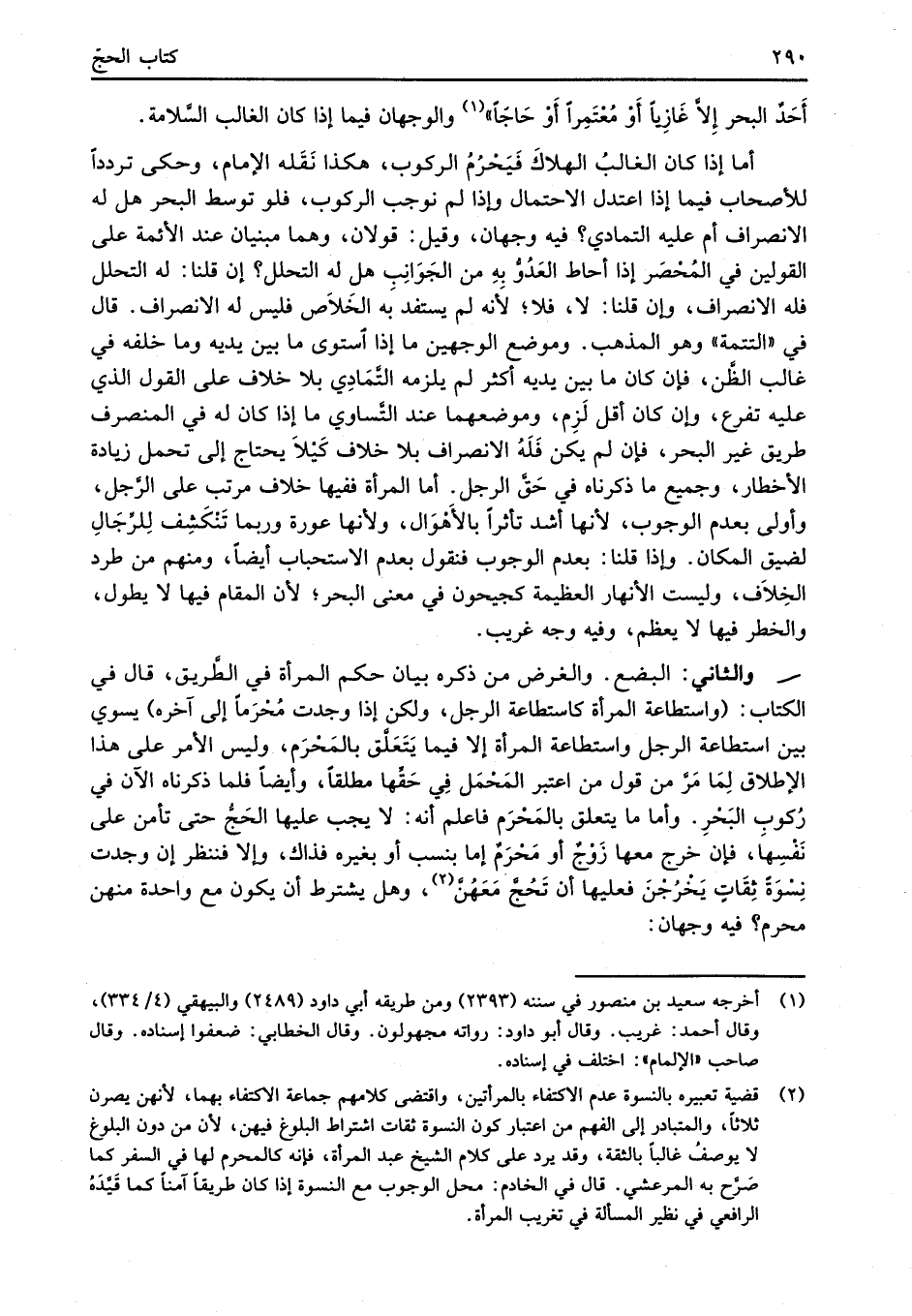 أما إذا كان الغالب الهلاكَ فَيَحْرُمُ الركوب، هكذا نَقَله الإمام، وحكى تردداً للأصحاب فيما إذا اعتدل الاحتمال وإذا لم نوجب الركوب، فلو توسط البحر هل له الانصراف أم عليه التمادي؟ فيه وجهان، وقيل: قولان، وهما مبنيان عند الأئمة على القولين في المُحْصَر إذا أحاط العَدُوُّ بهِ من الجَوَانِب هل له التحلل؟ إن قلنا: له التحلل فله الانصراف، وإن قلنا: لا، فلا؛ لَأنه لم يستفد بَه الخَلاَص فليس له الانصراف. قال في "التتمة" وهو المذهب. وموضع الوجهين ما إذا استوى ما بين يديه وما خلفه في غالب الظَّن، فإن كان ما بين يديه أكثر لم يلزمه التَّمَادِي بلا خلاف على القول الذي عليه تفرع، وإن كان أقل لَزِم، وموضعهما عند التَّساوي ما إذا كان له في المنصرف طريق غير البحر، فإن لم يكن فَلَهُ الانصراف بلا خلاف كَيْلاَ يحتاج إلى تحمل زيادة الأخطار، وجميع ما ذكرناه في حَقَّ الرجل. أما المرأة ففيها خلاف مرتب على الرَّجل، وأولى بعدم الوجوب، لأنها أشد تأثراً بالأَهْوَال، ولأنها عورة وربما تَنْكَشِف لِلرِّجَالِ لضيق المكان. وإذا قلنا: بعدم الوجوب فنقول بعدم الاستحباب أيضاً، ومنهم من طرد الخِلاَف، وليست الأنهار العظيمة كجيحون في معنى البحر؛ لأن المقام فيها لا يطول، والخطر فيها لا يعظم، وفيه وجه غريب.