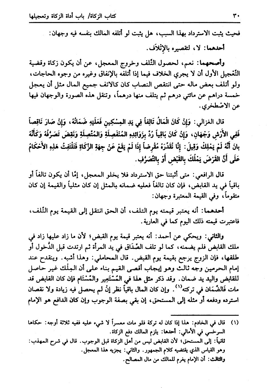 قال الغزالي: وَإِنْ كانَ الْمَالُ تَالِفاً فِي يَدِ المِسْكِينِ فَعَلَيْهِ ضَمَانُهُ، وَإِنْ صَارَ نَاقِصاً فَفِي الأَرْشِ وَجْهَانِ، وَإِنْ كَانَ بَاقِياً رُدَّ بِزَوَائِدِهِ المُنْفَصِلَةِ وَالمُتَّصِلَةِ وَنَقِضَ تَصَرُّفُة وَكَأنَّهُ بانَ أنَّهُ لَمْ يَمْلِكْ وَقِيلَ: إِنَّا نُقَدِّرَهُ مُقْرِضاً إِذَا لَمْ يقَعْ عَنْ جِهَةِ الزَّكَاةِ فَتَلْتَفِتُ هَذِهِ الأَحْكامُ عَلَى أَنَّ القَرْضَ يَمْلُكَ بِالقَبْضِ أَوْ بِالتَّصَرُّفِ.