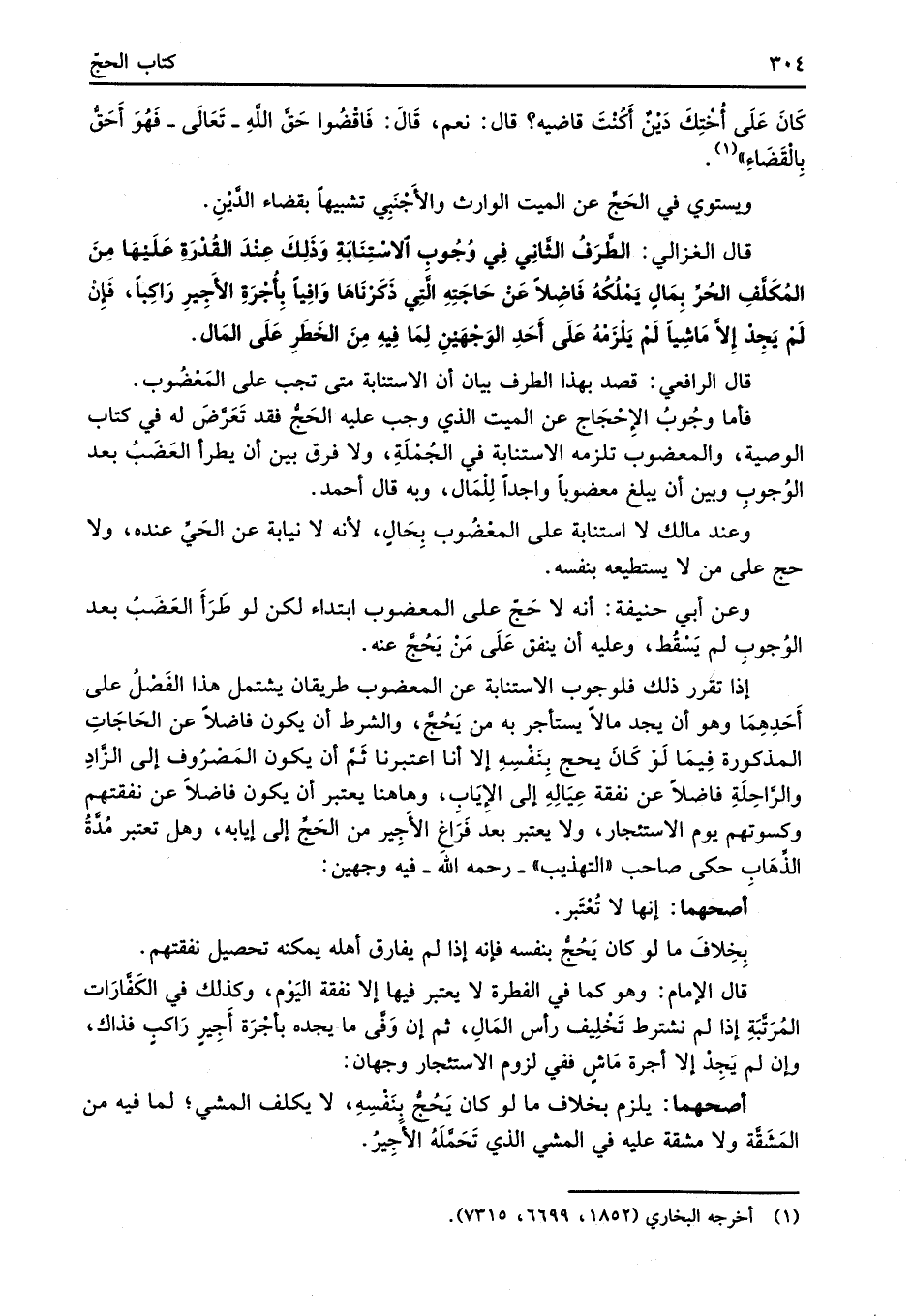 قال الغزالي: الطَّرَفُ الثَّانِي فِي وُجُوب الاسْتِنَابةِ وَذَلِكَ عِنْدَ القُدْرَةِ عَلَيْهَا مِنَ المُكَلَّفِ الحُرِّ بِمَالِ يَمْلكُهُ فَاضِلاً عَنْ حَاجَتِهِ الَّتِي ذَكَرْنَاهَا وَافِيًا بِأُجْرَةِ الأجِيرِ رَاكباً، فَإنْ لَمْ يَجِدْ إلاَّ مَاشِياً لَمْ يَلْزَمْهُ عَلَى أَحَدِ الوَجْهَيْنِ لِمَا فِيهِ مِنَ الخَطَرِ عَلَى المَال.