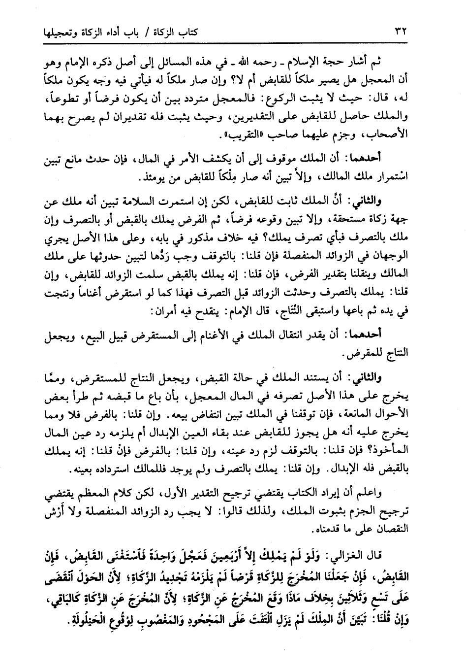 ثم أشار حجة الإسلام -رحمه الله- في هذه المسائل إلى أصل ذكره الإمام وهو أن المعجل هل يصير ملكاً للقابض أم لا؟ وإن صار ملكاً له فيأتي فيه وبه يكون ملكاً له، قال: حيث لا يثبت الركوع: فالمعجل متردد بين أن يكون فرضاً أو تطوعاً، والملك حاصل للقابض على التقديرين، وحيث يثبت فله تقديران لم يصرح بهما الأصحاب، وجزم عليهما صاحب "التقريب".