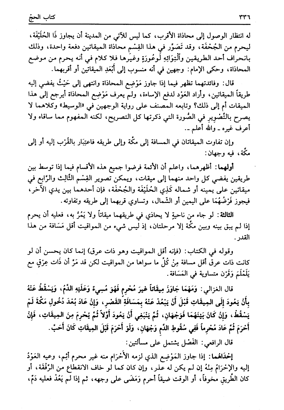 له انتظار الوصول إلى محاذاة الأقرب، كما ليس للآتي من المدينة أن يجاوز ذَا الحُلَيْفَة، ليحرم من الجُحْفَة، وقد تَصَوَّر في هذا القِسْمِ محاذاة الميقاتين دفعة واحدة، وذلك بانحراف أحد الطريقين والْتِوَائِهِ لَوعُورَةٍ وغيرها فلا كلام في أنه يحرم من موضع المحاذاة، وحكى الإمام: وجهين في أنه منسوب إلى أَبْعَدِ الميقاتين أو أقربهما.
