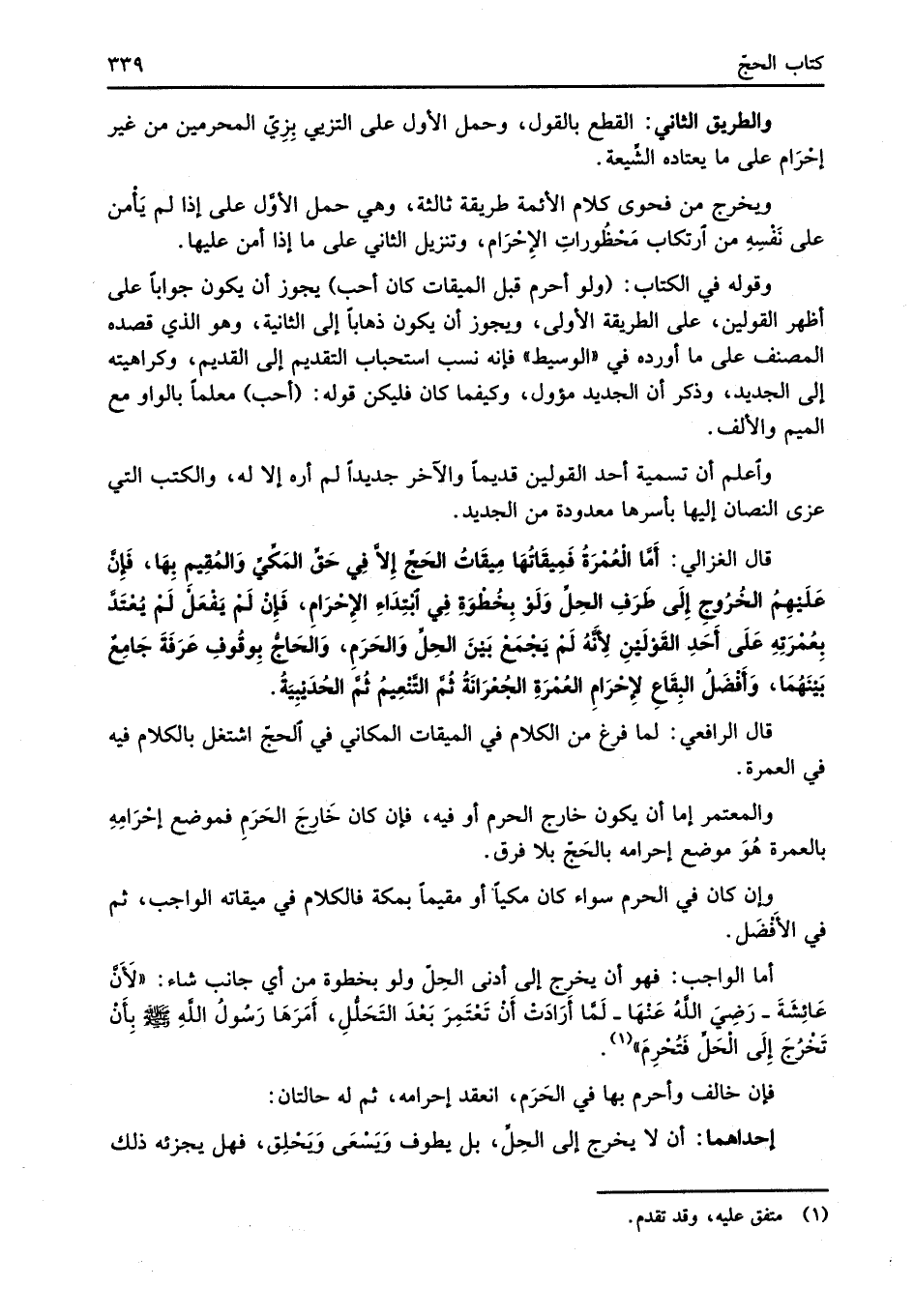 قال الغزالي: أَمَّا العُمْرَةُ فَمِيقَاتُهَا مِيقَاتُ الحَجِّ إلاَّ فِي حَقِّ المَكِّيِّ وَالمُقِيِم بِهَا، فَإِنَّ عَلَيْهِمُ الخُرُوجِ إلَى طَرَفِ الحِلِّ وَلَوْ بِخُطْوَةِ فِي ابْتِدَاءِ الإِحْرَامِ، فَإِنْ لَمْ يَفْعَلْ لَمْ يُعْتَدَّ بِعُمْرَتهِ عَلَى أَحَدِ القَوْلَيْنِ لِأَنَّهُ لَمْ يَجْمَعْ بَيْنَ الحِلِّ وَالحَرَمِ، وَالحَاجُّ بِوقُوفِ عَرَفَةَ جَامِعٌ بَيْنَهُمَا، وَأَفْضَلُ البِقَاعِ لإحْرَامِ العُمْرَةِ الجُعْرَانَةُ ثُمَّ التَّنْعِيمُ ثُمَّ الحُدَيْبِيَةُ.