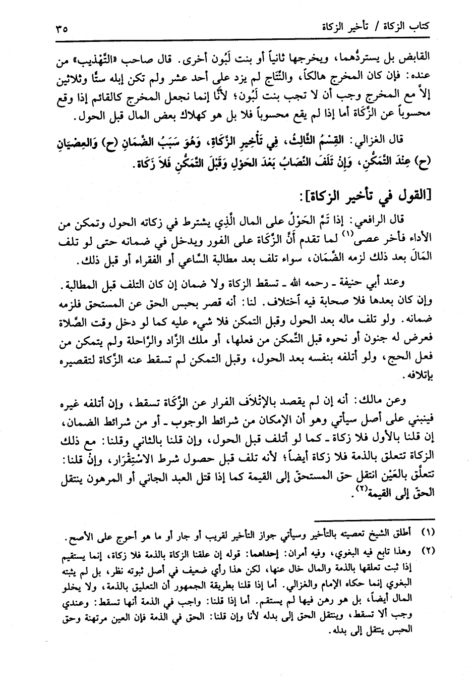 قال الغزالي: القِسْمُ الثَّالِثُ، فِي تَأْخِيرِ الزَّكَاةِ، وَهُوَ سَبَبُ الضَّمَانِ (ح) وَالعِصْيَانِ (ح) عِنْدَ التَّمَكُّنِ، وَإِنْ تَلَفَ النِّصَابُ بَعْدَ الحَوْلِ وَقَبْلَ التَّمَكُّنِ فَلاَ زَكَاة.