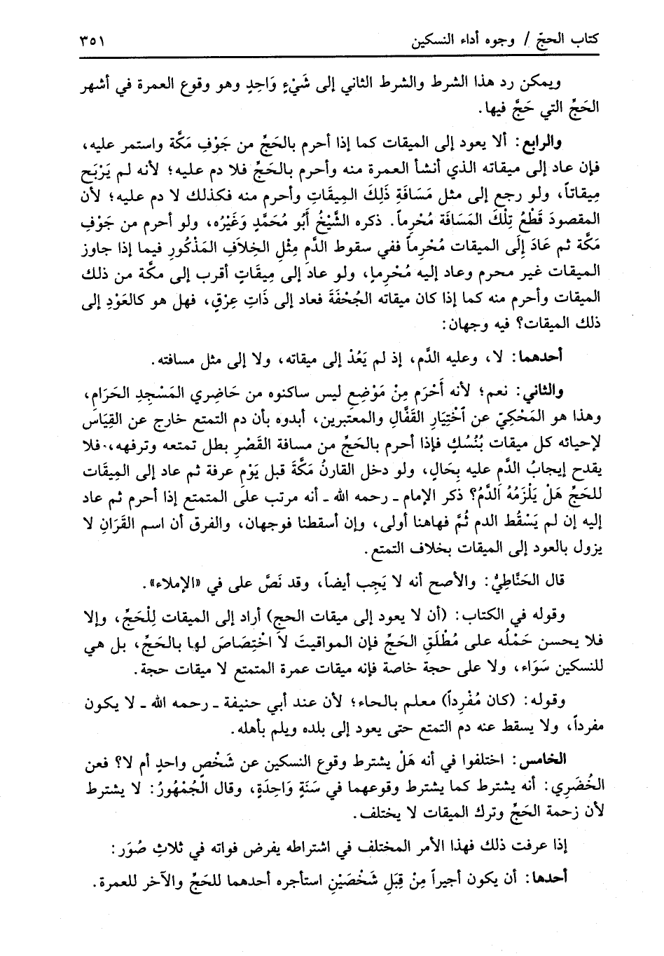 والرابع: ألا يعود إلى الميقات كما إذا أحرم بالحَجِّ من جَوْفِ مَكَّة واستمر عليه، فإن عاد إلى ميقاته الذي أنشأ العمرة منه وأحرم بالحَجِّ فلا دم عليه؛ لأنه لم يَرْبَح مِيقاتاً، ولو رجع إلى مثل مَسَافَةِ ذَلِكَ المِيقَاتِ وأحرم منه فكذلك لا دم عليه؛ لأن المقصودَ قَطْعُ تِلْكَ المَسَافَة مُحْرماً. ذكره الشَّيْخُ أَبُو مُحَمَّدٍ وَغَيْرُه، ولو أحرم من جَوْفِ مَكَّة ثم عَادَ إِلَى الميقات مُحْرِماً ففي سقوط الدَّمِ مِثلِ الخِلاَفِ المَذْكُورِ فيما إذا جاوز الميقات غير محرم وعاد إليه مُحْرِما، ولو عاد إلى مِيقَاتٍ أقرب إلى مكَّة من ذلك الميقات وأحرم منه كما إذا كان ميقاته الجُحْفَةَ فعاد إلى ذَاتِ عِرْقٍ، فهل هو كالعَوْدِ إلى ذلك الميقات؟ فيه وجهان: