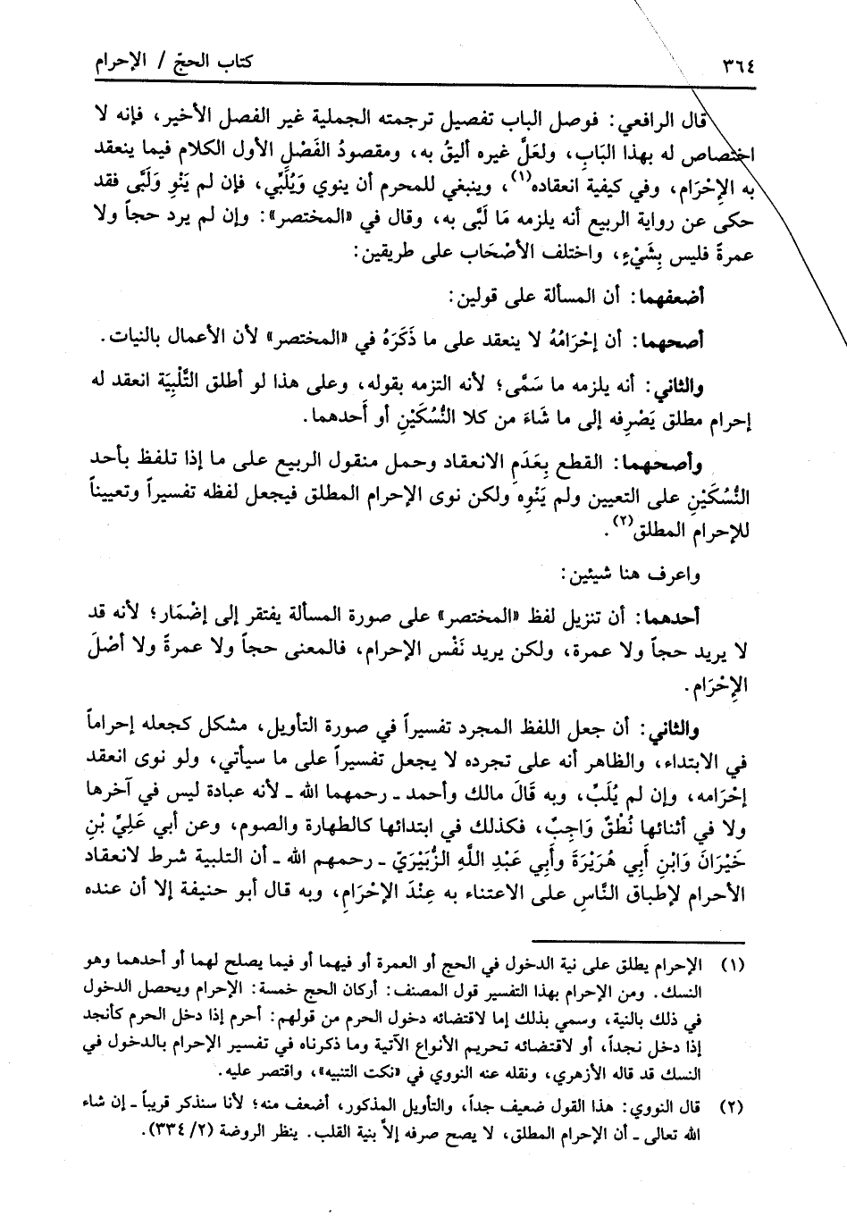(¬1) الإحرام يطلق على نية الدخول في الحج أو العمرة أو فيهما أو فيما يصلح لهما أو أحدهما وهو النسك. ومن الإحرام بهذا التفسير قول المصنف: أركان الحج خمسة: الإحرام ويحصل الدخول في ذلك بالنية، وسمي بذلك إما لاقتضائه دخول الحرم من قولهم: أحرم إذا دخل الحرم كأنجد إذا دخل نجداً، أو لاقتضائه تحريم الأنواع الآتية وما ذكرناه في تفسير الإحرام بالدخول في النسك قد قاله الأزهري، ونقله عنه النووي في "نكت التنبيه"، واقتصر عليه.