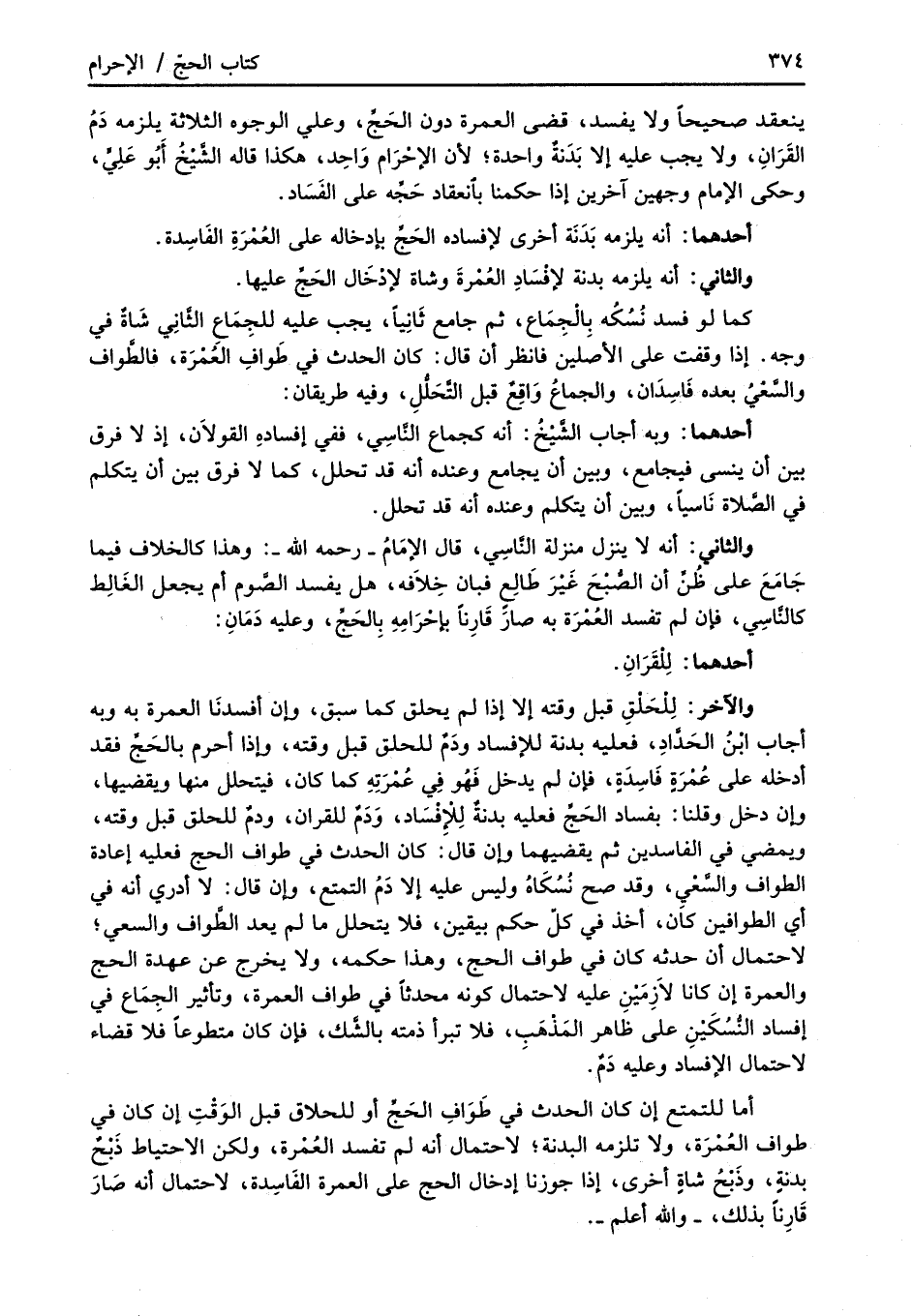 والآخر: لِلْحَلْقِ قبل وقته إلا إذا لم يحلق كما سبق، وإن أفسدنَا العمرة به وبه أجاب ابْنُ الحَدَّادِ، فعليه بدنة للإفساد ودَمٌ للحلق قبل وقته، وإذا أحرم بالحَجِّ فقد أدخله على عُمْرَةٍ فَاسِدَةٍ، فإن لم يدخل فَهُو فِي عُمْرَتِهِ كما كان، فيتحلل منها ويقضيها، وإن دخل وقلنا: بفساد الحَجِّ فعليه بدنةٌ لِلإفْسَاد، وَدَمٌ للقران، ودمٌ للحلق قبل وقته، ويمضي في الفاسدين ثم يقضيهما وإن قالَ: كان الحدث في طواف الحج فعليه إعادة الطواف والسَّعْي، وقد صح نُسُكَاهُ وليس عليه إلا دَمُ التمتع، وإن قال: لا أدري أنه في أي الطوافين كاَن، أخذ في كلّ حكم بيقين، فلا يتحلل ما لم يعد الطَّواف والسعي؛ لاحتمال أن حدثه كان في طواف الحج، وهذا حكمه، ولا يخرج عن عهدة الحج والعمرة إن كانا لاَزِمَيْنِ عليه لاحتمال كونه محدثاً في طواف العمرة، وتأثير الجِمَاع في إفساد النُّسُكَينِ على ظاهر المَذْهَب، فلا تبرأ ذمته بالشَّك، فإن كان متطوعاً فلا قضاء لاحتمال الإفساد وعليه دَمٌ.