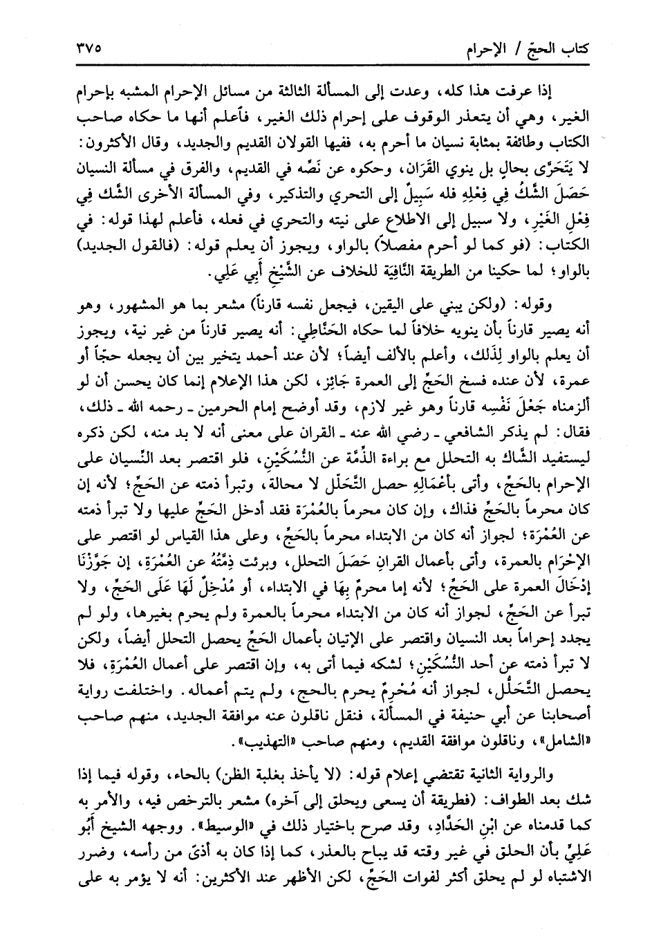 إذا عرفت هذا كله، وعدت إلى المسألة الثالثة من مسائل الإحرام المشبه بإحرام الغير، وهي أن يتعذر الوقوف على إحرام ذلك الغير، فاعلم أنها ما حكاه صاحب الكتاب وطائفة بمثابة نسيان ما أحرم به، ففيها القولان القديم والجديد، وقال الأكثرون: لا يَتَحَرَّى بحالِ بل ينوي القَرَان، وحكوه عن نَصِّه في القديم، والفرق في مسألة النسيان حَصَلَ الشَّكُ فِي فِعْلِهِ فله سَبيلٌ إلى التحري والتذكير، وفي المسألة الأخرى الشَّك فِي فِعْلِ الغَيْرِ، ولا سبيل إلى الاطلاع على نيته والتحري في فعله، فأعلم لهذا قوله: في الكتاب: (فو كما لو أحرم مفصلاً) بالواو، ويجوز أن يعلم قوله: (فالقول الجديد) بالواو؛ لما حكينا من الطريقة النَّافِيَة للخلاف عن الشَّيْخِ أَبِي عَلِي.