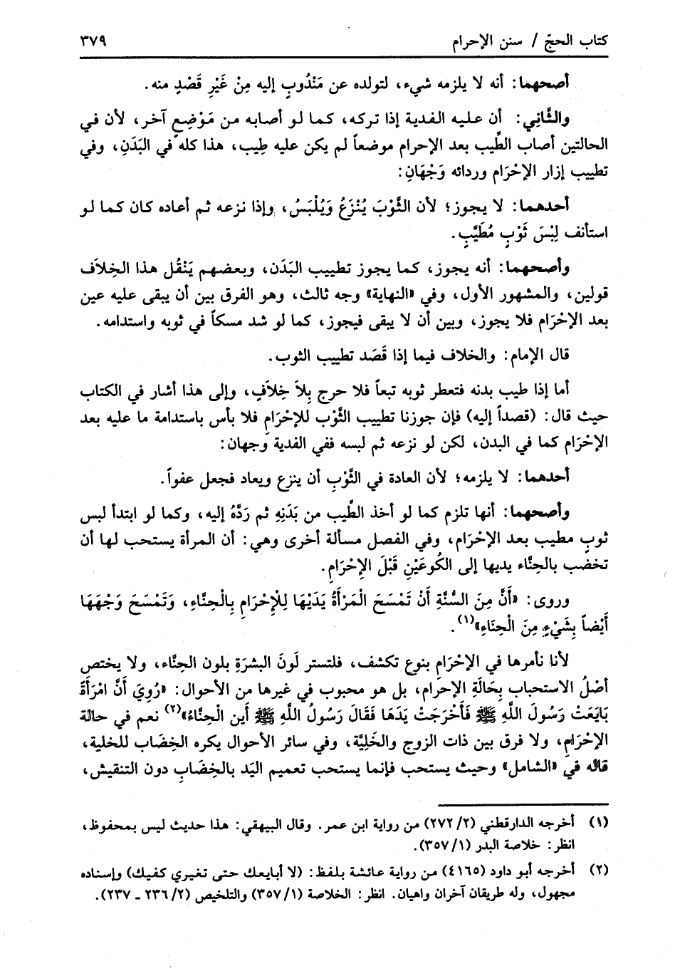 وأصحهما: أنها تلزم كما لو أخذ الطَّيب من بَدَنِهِ ثم رَدَّهُ إليه، وكما لو ابتدأ لبس ثوب مطيب بعد الإحْرَام، وفي الفصل مسألة أخرى وهي: أن المرأة يستحب لها أن تخضب بالحِنَّاء يديها إلى الكُوعَيْنِ قَبلَ الإِحْرَامِ.