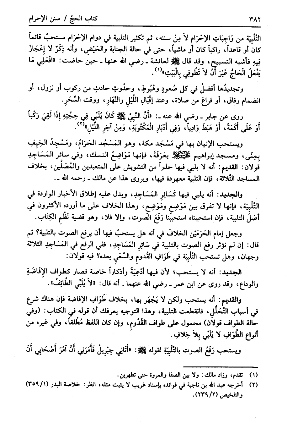 ويستحب الإتيان بها في مَسجَد مكة، وهو المَسْجُد الحَرَامُ، ومَسْجِدُ الخِيِفِ بِمِنًى، ومسجد إبراهيم عليه السلام بعَرَفَةَ، فإنها مَوَاضِعُ النسك، وفي سائر المَسَاجِدِ قولان: القديم: أنه لا يلبي فيها حذراً من التشويش على المتعبدين والمُصَلِّين، بخلاف المساجد الثَّلاثة، فإن التلبية معهودة فيها، ويروى هذا عن مالك -رحمه الله-.