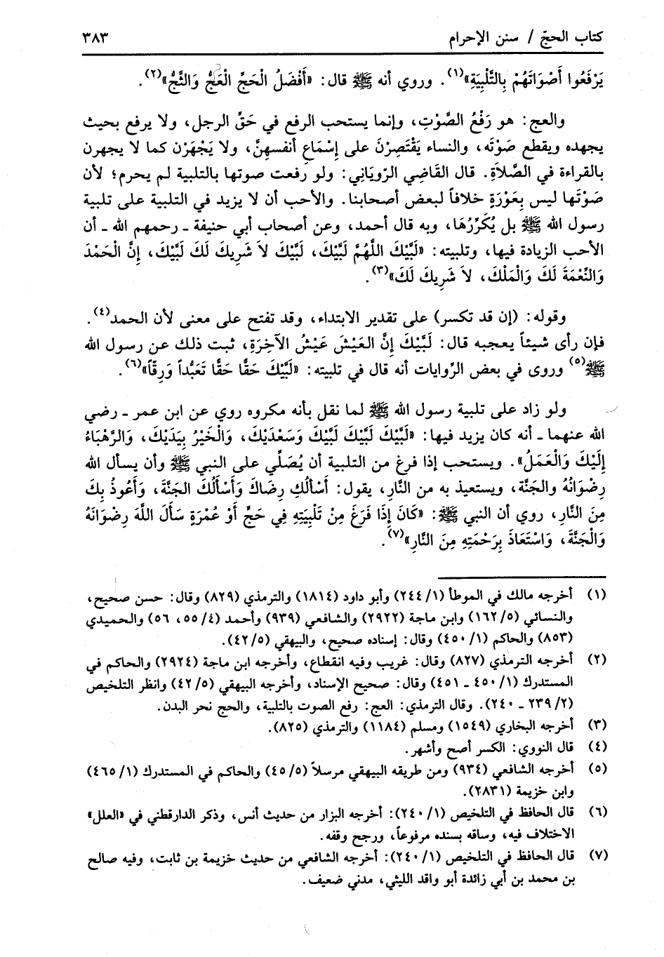والعج: هو رَفْعُ الصَّوْتِ، وإنما يستحب الرفع في حَقِّ الرجل، ولا يرفع بحيث يجهده ويقطع صَوْتَه، والنساء يَقْتَصِرْنَ على إِسْمَاع أنفسهِنَّ، ولا يَجْهَرْن كما لا يجهرن بالقراءة في الصَّلاَةِ. قال القَاضِي الرّوَيانِي: ولو رَفعت صوتها بالتلبية لم يحرم؛ لأن صَوْتَها ليس بعَوْرَةِ خلافاً لبعض أصحابنا. والأحب أن لا يزيد في التلبية على تلبية رسول الله -صلى الله عليه وسلم- بل يُكَرِّرُهَا، وبه قال أحمد، وعن أصحاب أبي حنيفة -رحمهم الله- أن الأحب الزيادة فيها، وتلبيته: "لَبَّيْكَ اللَّهُمَّ لَبَّيْكَ، لَبَّيْكَ لاَ شَرِيكَ لَكَ لَبَّيْكَ، إِنَّ الْحَمْدَ وَالنِّعمَةَ لَكَ وَالْمَلْكَ، لاَ شَرِيكَ لَكَ" (¬3).