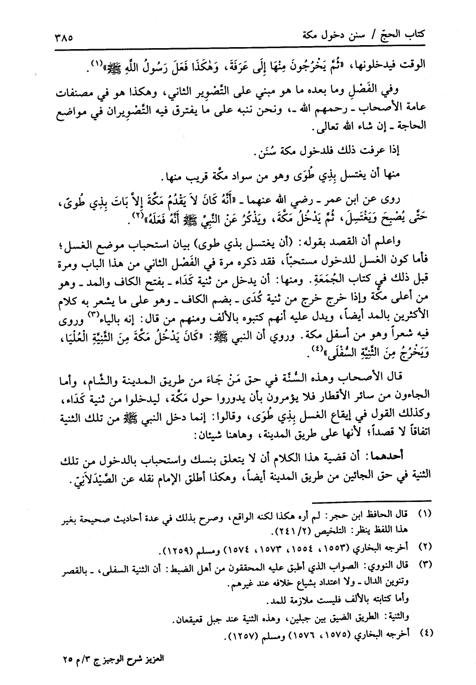 قال الأصحاب وهذه السُّنَّة في حق مَنْ جَاءَ من طريق المدينة والشَّام، وأما الجاءون من سائر الأقطار فلا يؤمرون بأن يدوروا حول مَكَّة، ليدخلوا من ثنية كَدَاء، وكذلك القول في إيقاع الغسل بِذِي طُوَى، وقالوا: إنما دخل النبي -صلى الله عليه وسلم- من تلك الثنية اتفاقاً لا قصداً؛ لأنها على طريق المدينة، وهاهنا شيئان: