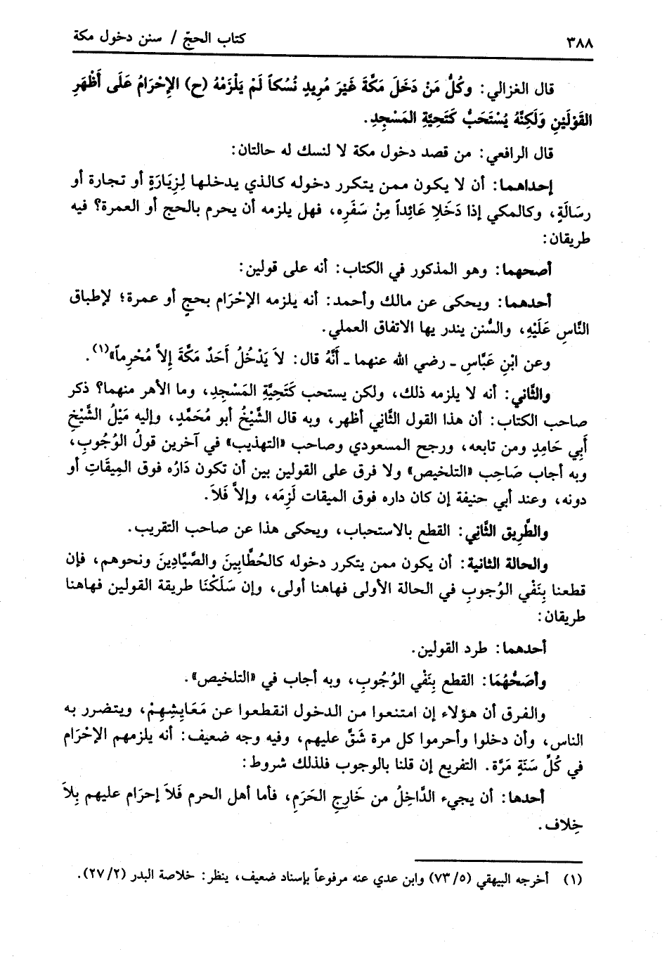 قال الغزالي: وكُلُّ مَنْ دَخَلَ مَكَّةَ غَيْرَ مُرِيدٍ نُسُكاً لَمْ يَلْزَمْهُ (ح) الإحْرَامُ عَلَى أَظْهَرِ القَوْلَيْنِ وَلَكِنَّهُ يُسْتَحَبُّ كَتَحِيَّةِ المَسْجِدِ.