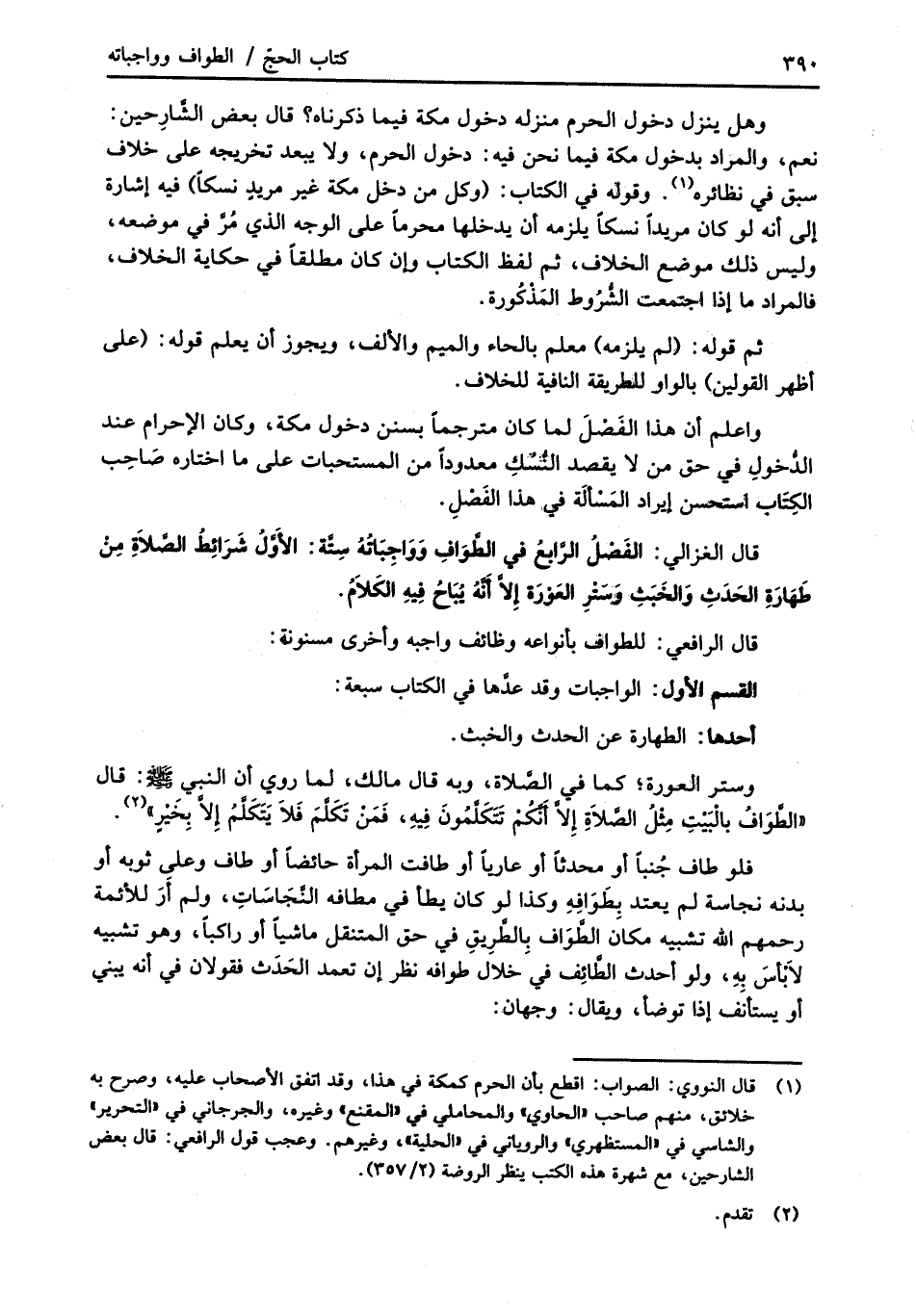 قال الغزالي: الفَصْلُ الرَّابعُ في الطَّوَافِ وَوَاجِبَاُتهُ سِتَّة: الأَوَّلُ شَرَائِطُ الصَّلاَةِ مِنْ طَهَارَةِ الحَدَثِ وَالخَبَثِ وَسَتْرِ العَوْرَة إلاَّ أنَّهُ يُبَاحُ فِيهِ الكَلاَمُ.