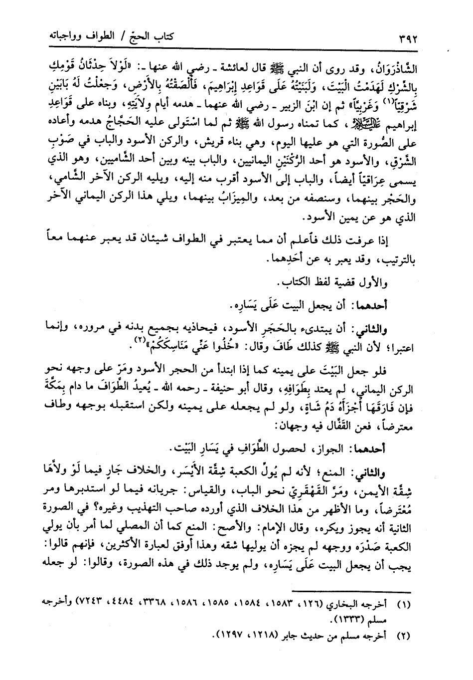فلو جعل البَيْتَ على يمينه كما إذا ابتدأ من الحجر الأسود ومَرّ على وجهه نحو الركن اليمانى، لم يعتد بِطَوَافِهِ، وقال أبو حنيفة -رحمه الله- يُعيدُ الطَّوَافَ ما دام بمَكَّةَ فإن فَارَقَهَا أجْزَأَهُ دَمُ شَاةٍ، ولو لم يجعله على يمينه ولكن استقبله بوجهه وطاف معترضاً، فعن القَفَّال فيه وجهان: