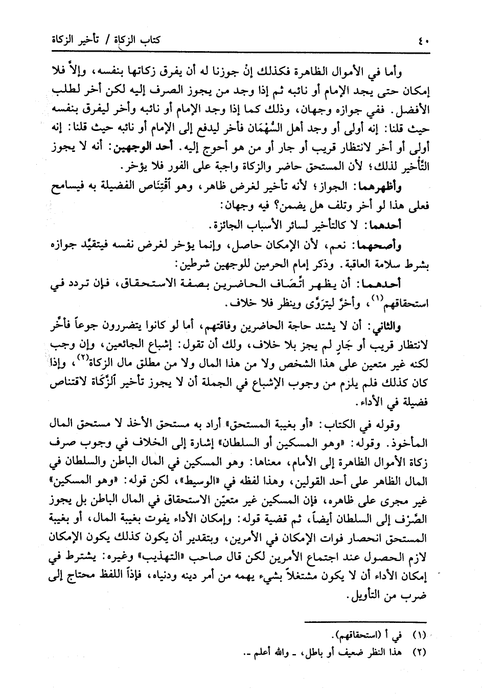 وأما في الأموال الظاهرة فكذلك إنْ جوزنا له أن يفرق زكاتها بنفسه، وإلاَّ فلا إمكان حتى يجد الإمام أو نائبه ثم إذا وجد من يجوز الصرف إليه لكن أخر لطلب الأفضل. ففي جوازه وجهان، وذلك كما إذا وجد الإمام أو نائبه وأخر ليفرق بنفسه حيث قلنا: إنه أولى أو وجد أهل السُّهْمَان فأخر ليدفع إلى الإمام أو نائبه حيث قلنا: إنه أولى أو أخر لانتظار قريب أو جار أو من هو أحوج إليه. أحد الوجهين: أنه لا يجوز التَّأْخير لذلك؛ لأن المستحق حاضر والزكاة واجبة على الفور فلا يؤخر.