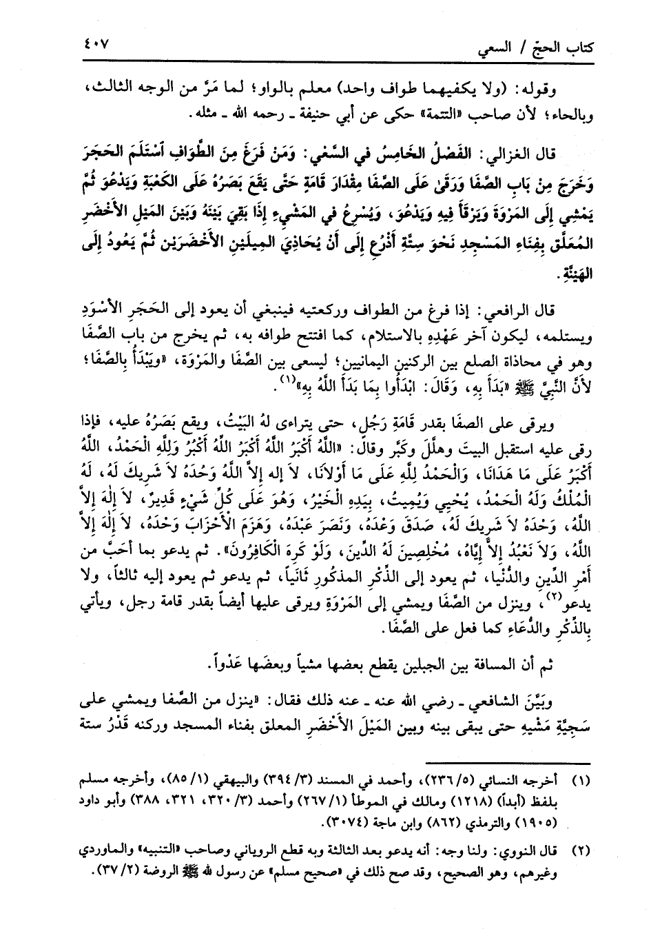 قال الغزالي: الفَصْلُ الخَامِس في السَّعْي: وَمَنْ فرَغَ مِنَ الطَّوَافِ اسْتَلَمَ الحَجَرَ وَخَرَجَ مِنْ بَابِ الصَّفَا وَرَقَى عَلَى الصَّفَا مِقْدَارَ قَامَةٍ حَتَّى يَقَعَ بَصَرُهُ عَلَى الكَعْبَةِ وَيدْعُوَ ثُمَّ يَمْشِي إِلَى المَرْوَةَ وَيَرْقَأَ فِيهِ وَيَدْعُوَ، وَيُسْرِعُ في المَشْيِءِ إِذَا بَقِيَ بَيْنَهُ وَبَيْنَ المَيْلِ الأَخْضَرِ المُعَلَّق بِفِنَاءِ المَسْجِدِ نَحْوَ سِتَّةِ أَذْرُعِ إِلَى أَنْ يُحَاذِيَ المِيلَيْنِ الأَخْضَرَيْن ثُمَّ يَعُودُ إلَى الهَيْنَّةِ.
