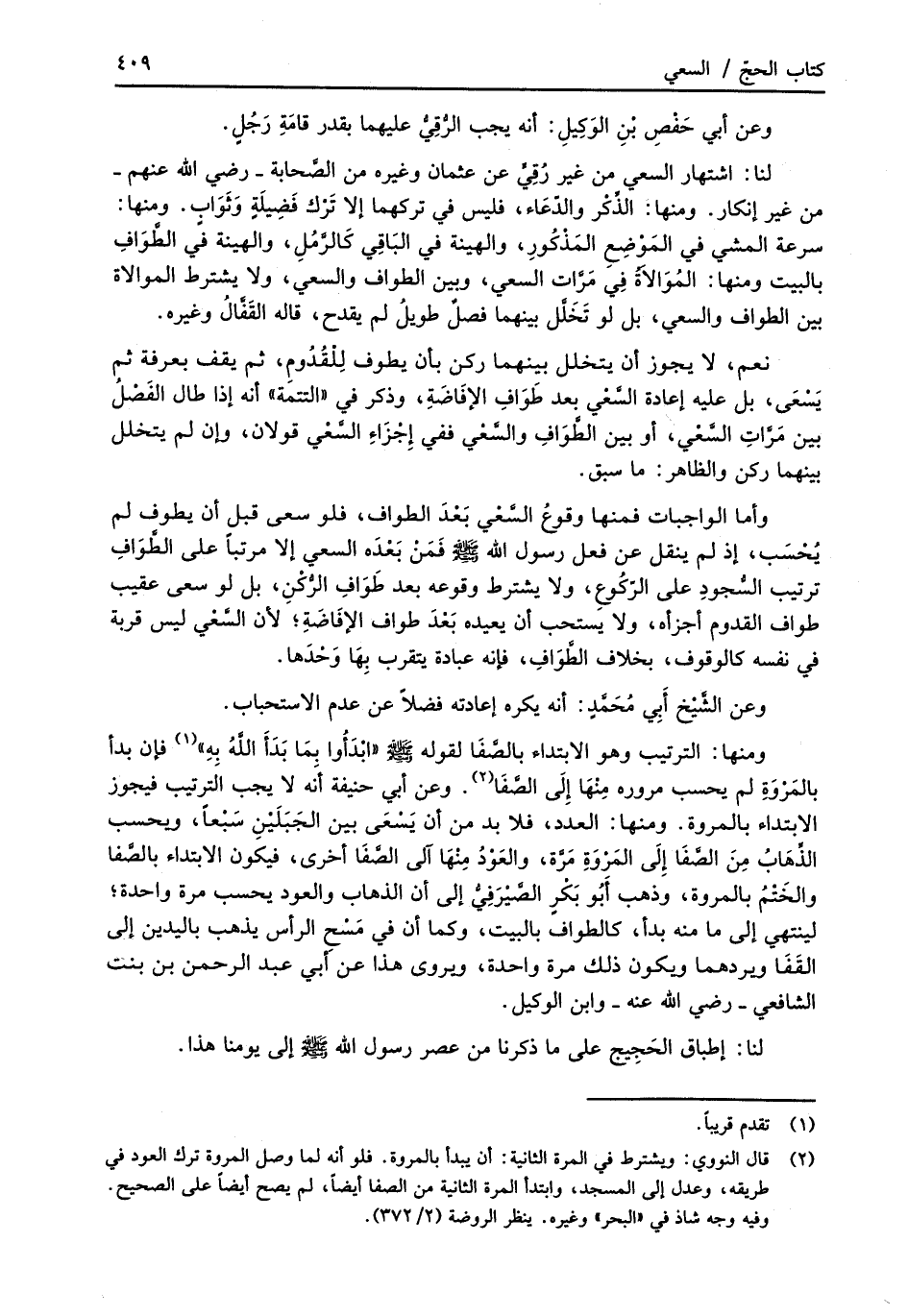 لنا: اشتهار السعي من غير رُقِيٍّ عن عثمان وغيره من الصَّحابة -رضي الله عنهم- من غير إنكار. ومنها: الذِّكْر والدّعَاء، فليس في تركهما إلا تَرْك فَضِيلَةٍ وَثَوَابٍ. ومنها: سرعة المشي في المَوْضِعِ المَذْكُورِ، والهينة في البَاقِي كَالرَّمُلِ، والهينة في الطَّوَافِ بالبيت ومنها: المُوَالاةُ فِي مَرَّات السعي، وبين الطواف والسعي، ولا يشترط الموالاة بين الطواف والسعي، بل لو تَخَلَّل بينهما فصلٌ طويلُ لم يقدح، قاله القَفَّالُ وغيره.