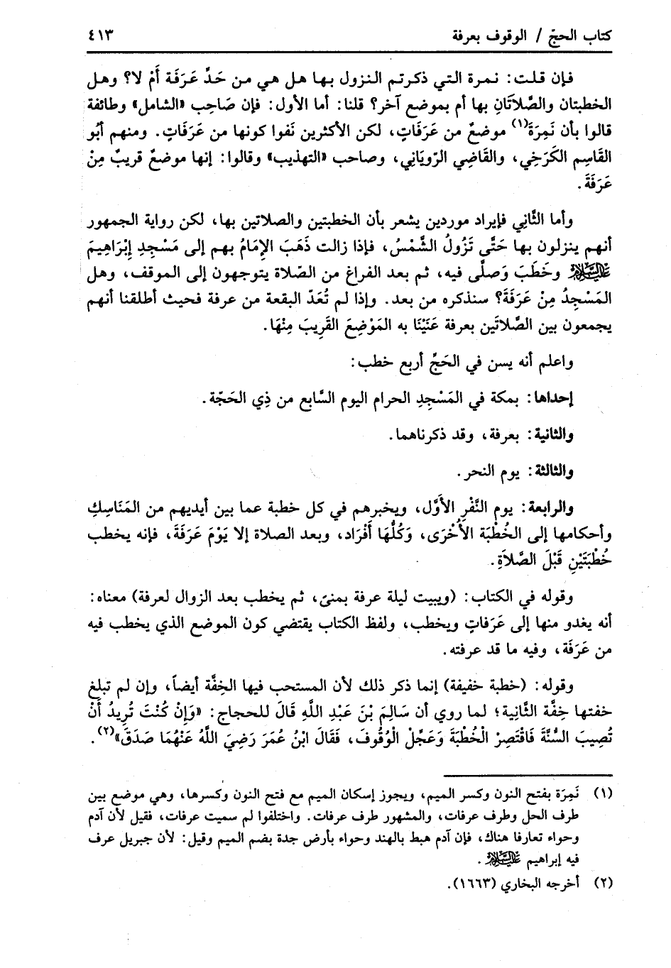 وأما الثَّانِي فإيراد موردين يشعر بأن الخطبتين والصلاتين بها، لكن رواية الجمهور أنهم ينزلون بها حَتَّى تَزُولُ الشَّمْسُ، فإذا زالت ذَهَبَ الإِمَامُ بهم إلى مَسْجِدِ إِبْرَاهِيمَ عليه السلام وخَطَبَ وَصلَّى فيه، ثم بعد الفراغ من الصّلاة يتوجهون إلى الموقف، وهل المَسْجِدُ مِنْ عَرَفَةَ؟ سنذكره من بعد. وإذا لم تُعَدّ البقعة من عرفة فحيث أطلقنا أنهم يجمعون بين الصَّلاتَين بعرفة عَنَيْنَا به المَوْضِعَ القَرِيبَ مِنْهَا.